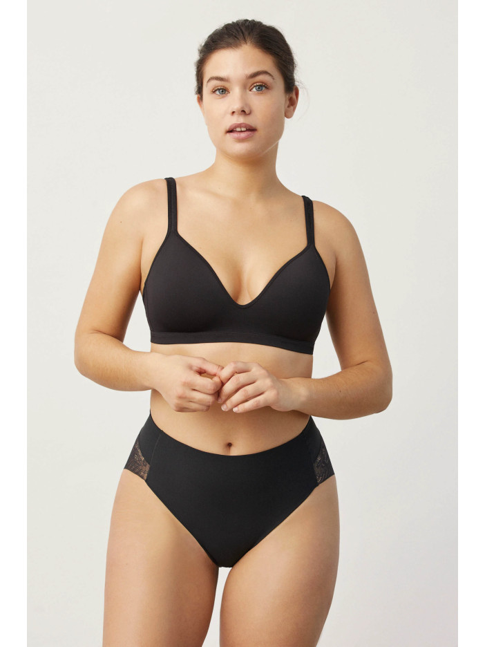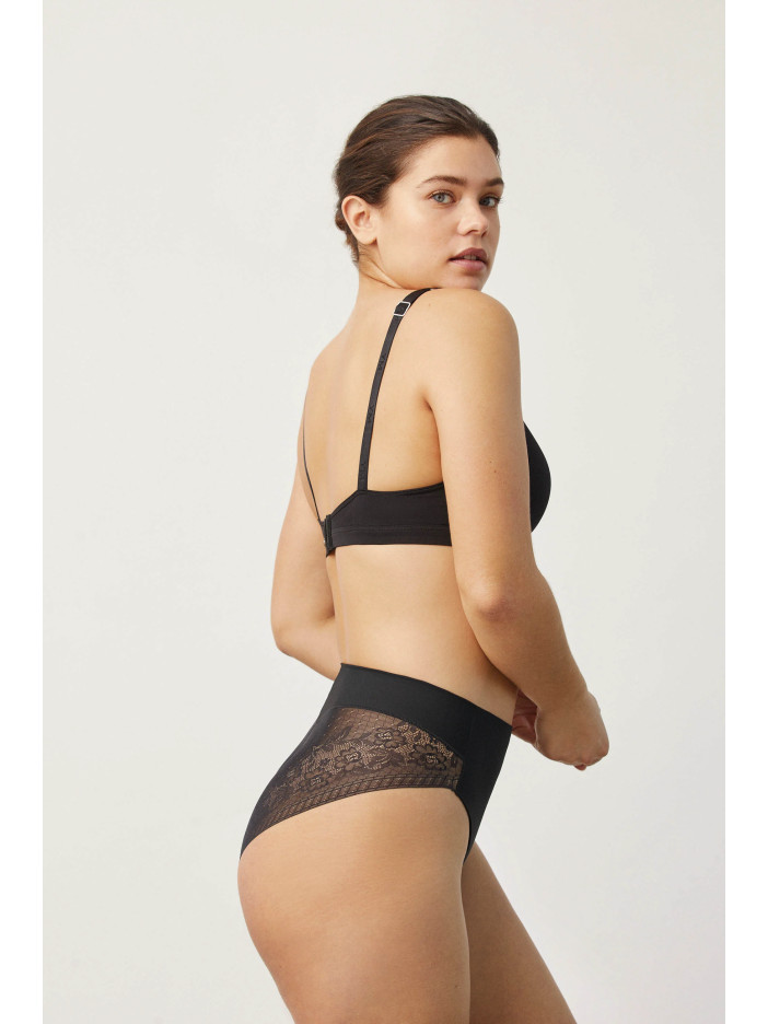 Корректирующие трусы комфортной посадки выполнены из тонкого, упругого и эластичного полотна, которое мягко прилегает к телу и обеспечивает уверенную поддержку без ощущения стянутости. Усиленная зона коррекции в области живота помогает сформировать более стройный и подтянутый силуэт, а гладкая передняя часть остаётся незаметной даже под тонкой и облегающей одеждой. Бесшовная кружевная задняя деталь красиво подчёркивает формы и исключает видимые линии, добавляя образу женственности. Хлопковая ластовица дарит дополнительный комфорт и ощущение свежести, позволяя чувствовать себя уверенно и элегантно каждый день.