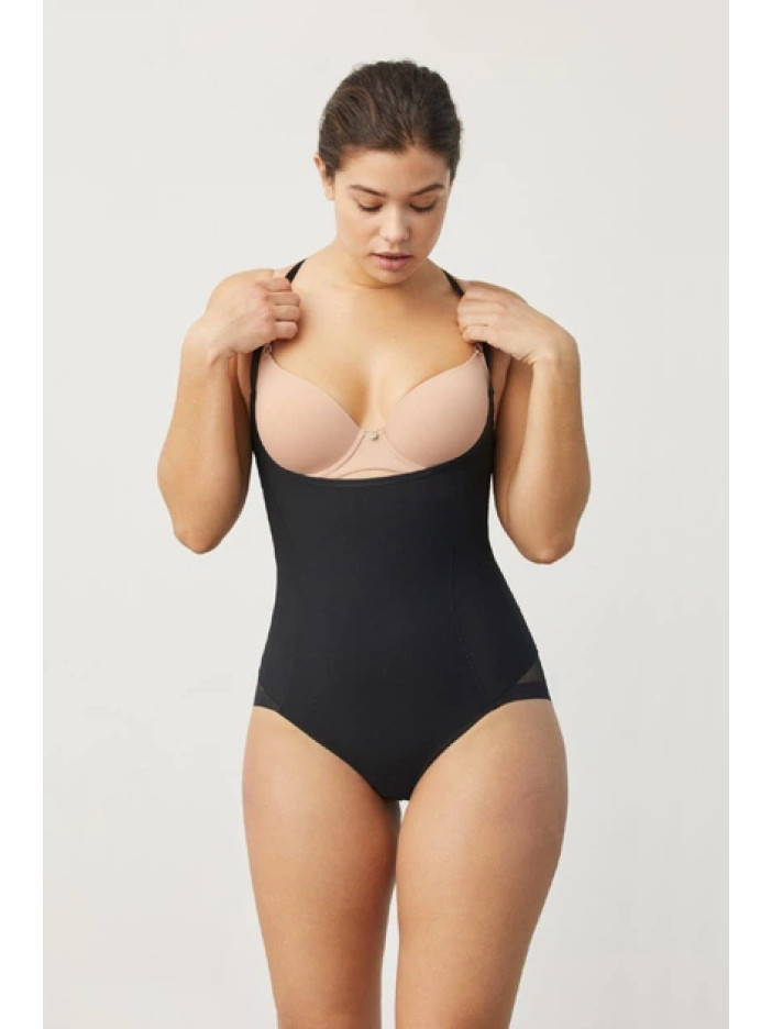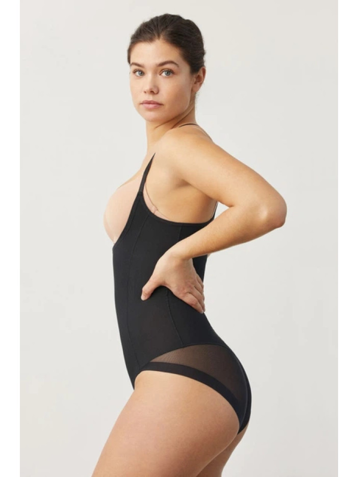 Чёрное утягивающее боди с усиленной зоной коррекции создано для выразительного, подтянутого силуэта и уверенности в каждом движении. Плотная моделирующая ткань эффективно формирует талию, живот и бёдра, сглаживая линии и создавая стройный контур без лишнего объёма. Анатомичный вырез под грудью обеспечивает дополнительную поддержку и позволяет сочетать боди с любимым бюстгальтером, сохраняя красивую линию декольте. Модель на бретелях комфортно фиксируется по фигуре, подчёркивая изгибы и формируя эффектный, женственный силуэт — идеальный выбор под облегающие платья и особые образы.