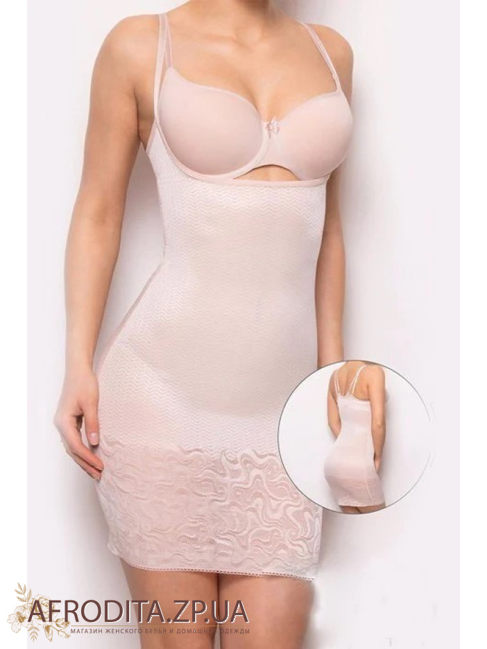 Корректирующее платье Orhideja 134345 без лифа из тонкой, но функциональной, шелковистой ткани, структура которой из «елки» переходит в роскошное кружево, что придает изделию элегантность.