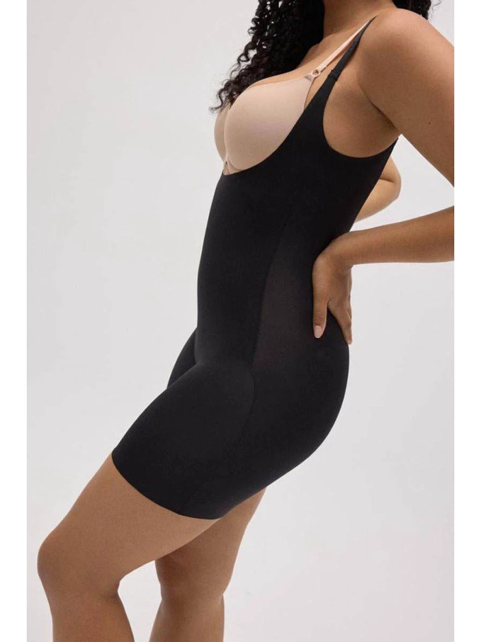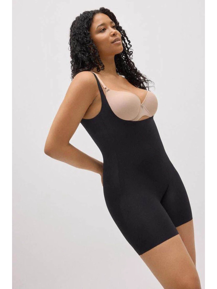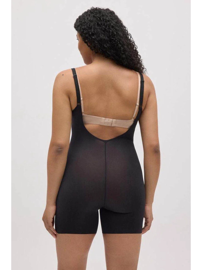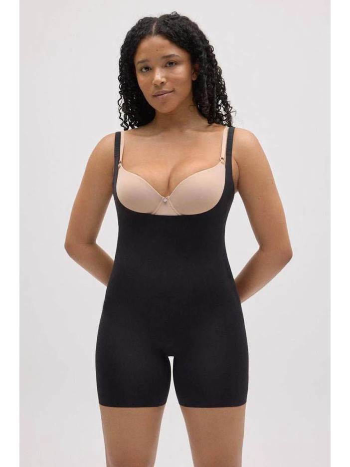 Чёрное утягивающее боди от Ysabel Mora с бретелями создаёт идеально гладкий силуэт, мягко моделируя талию, живот, бёдра и ягодицы без резких линий. Открытая зона груди позволяет носить боди с любимым бюстгальтером, что делает его идеальным выбором для платьев с глубоким V-вырезом, вечерних образов и полупрозрачной одежды. Средняя степень коррекции подчёркивает естественные формы, не сковывая движений, а тонкий эластичный материал облегает тело как вторая кожа, обеспечивая комфорт и уверенность на весь день.