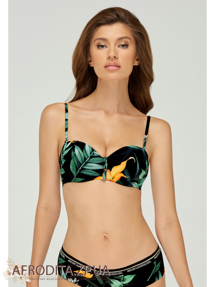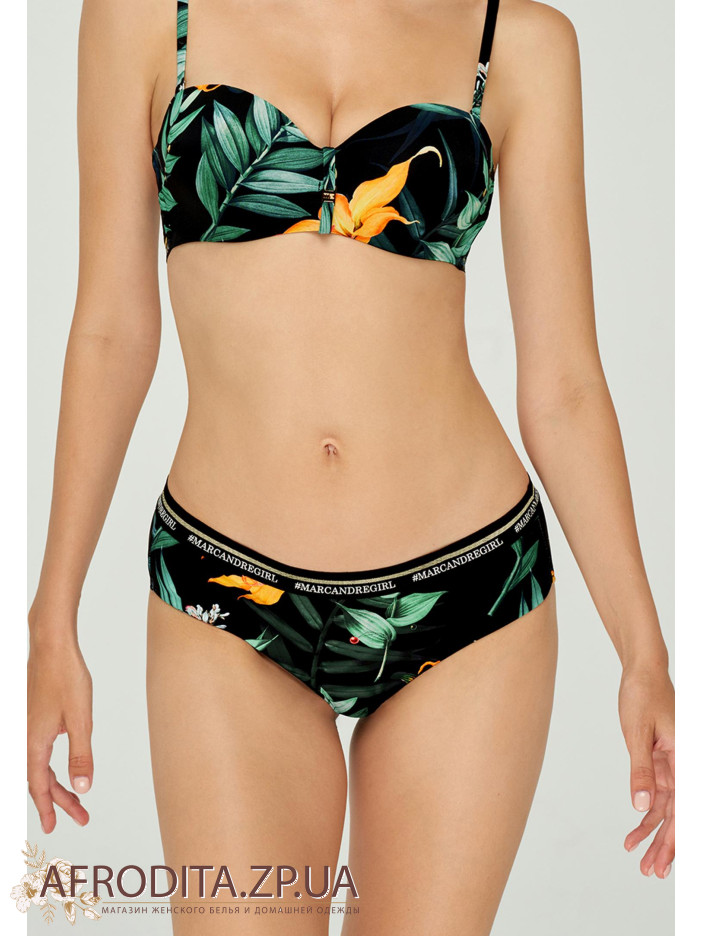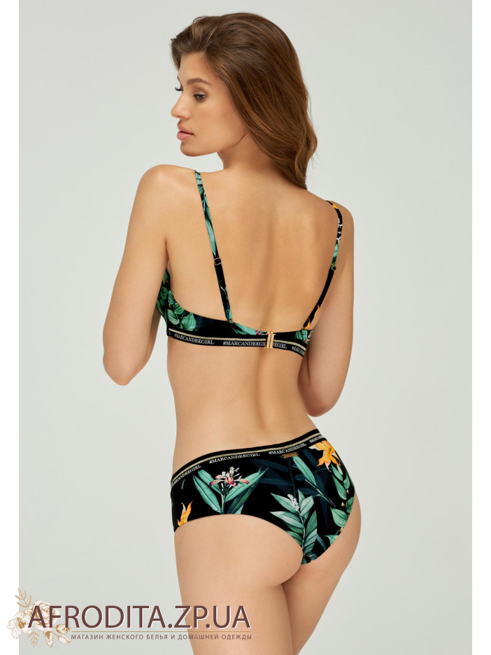 Формованная чашка «бандо» на каркасной поддержке. Съемные бретели. На спине застежка. Брифы-бразилиана со средней линией талии. Отделка резинкой с логотипом MARC & ANDRÉ.