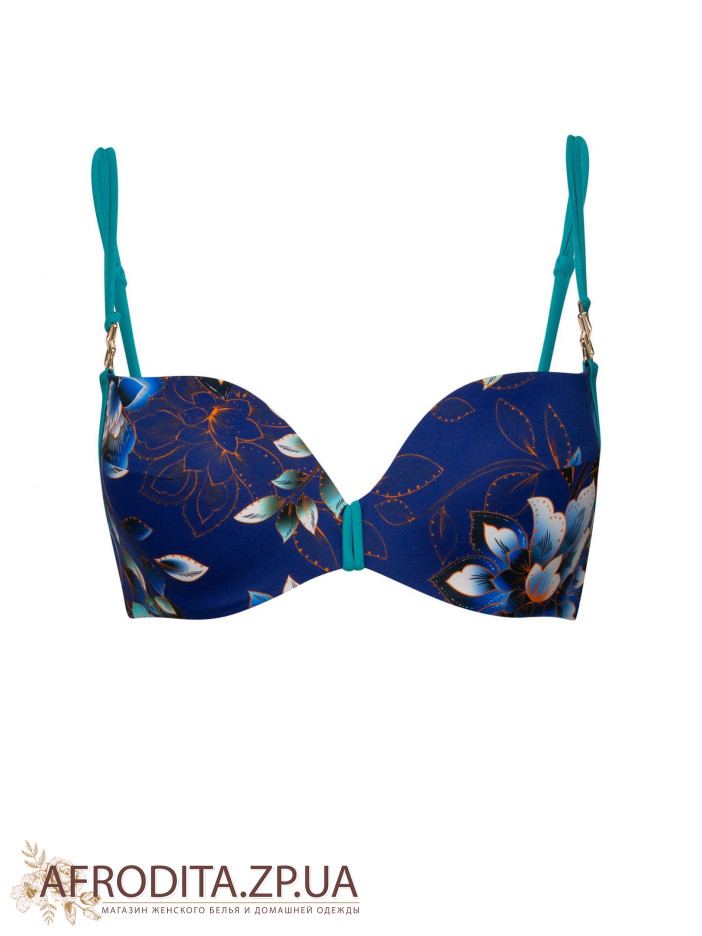 Верх купальника с формованными чашками на каркасной поддержке. Со съёмными подушками «пуш-ап». Регулируемые сдвоенные бретели отстегиваются на спинке, что дает возможность завязать их на шее, либо пристегнуть крест на  крест. На спине застежка. Трусики - брифы со средней линией талии, полностью проложены вторым слоем высококачественной микрофибры.