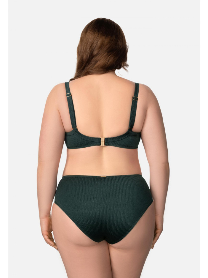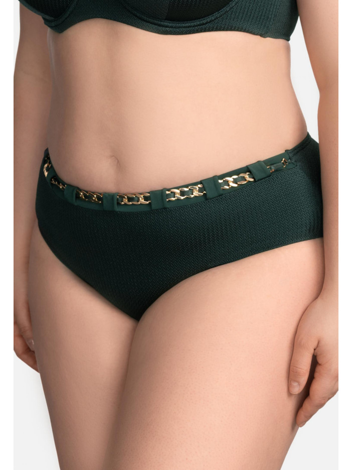 MODERN ELEGANCE – серия, в которой сдержанная простота превращается в утонченную роскошь. Глубокий темно-зеленый жаккард с узором "елочка" и благородной текстурой создает гармоничный и изысканный силуэт. Съемные декоративные цепочки придают образам гибкости и характера, делая дерзкий акцент. Брифы со средней посадкой подчеркивают естественные изгибы фигуры, создавая гармоничный и женственный силуэт. Впереди декоративный атласный пояс с петлями под съемный аксессуар-цепочка добавляет изысканный акцент и позволяет варьировать образ по настроению.