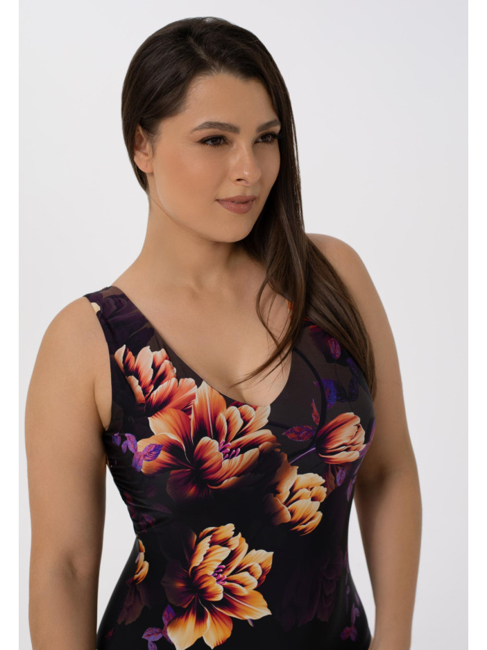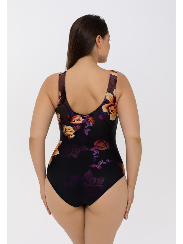 Эксклюзивный флористический принт Терракотовый фон и лиловая подкладка Вшитые корректоры Поддерживающая резинка под грудью Подходит для пышных форм Открытая спина Placement-принт спереди и сзади