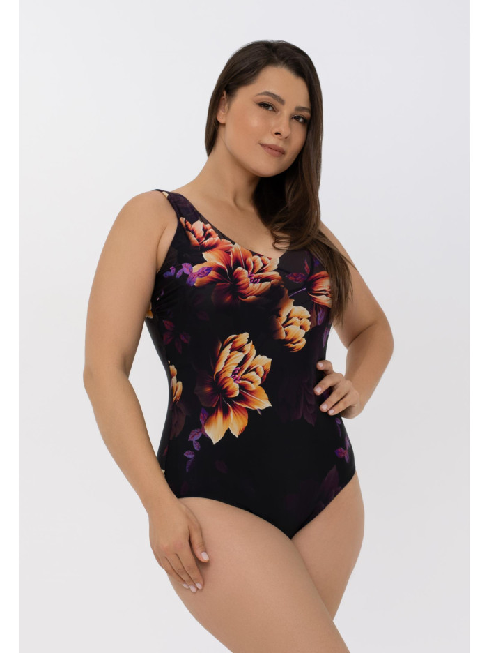 Слитный купальник с тонкими вшитыми корректорами и поддерживающей резинкой под грудью идеально подходит для обладательниц пышных форм. Открытая спина добавляет образу лёгкости и женственности, а акцентный placement-принт спереди и сзади делает модель ещё более выразительной.