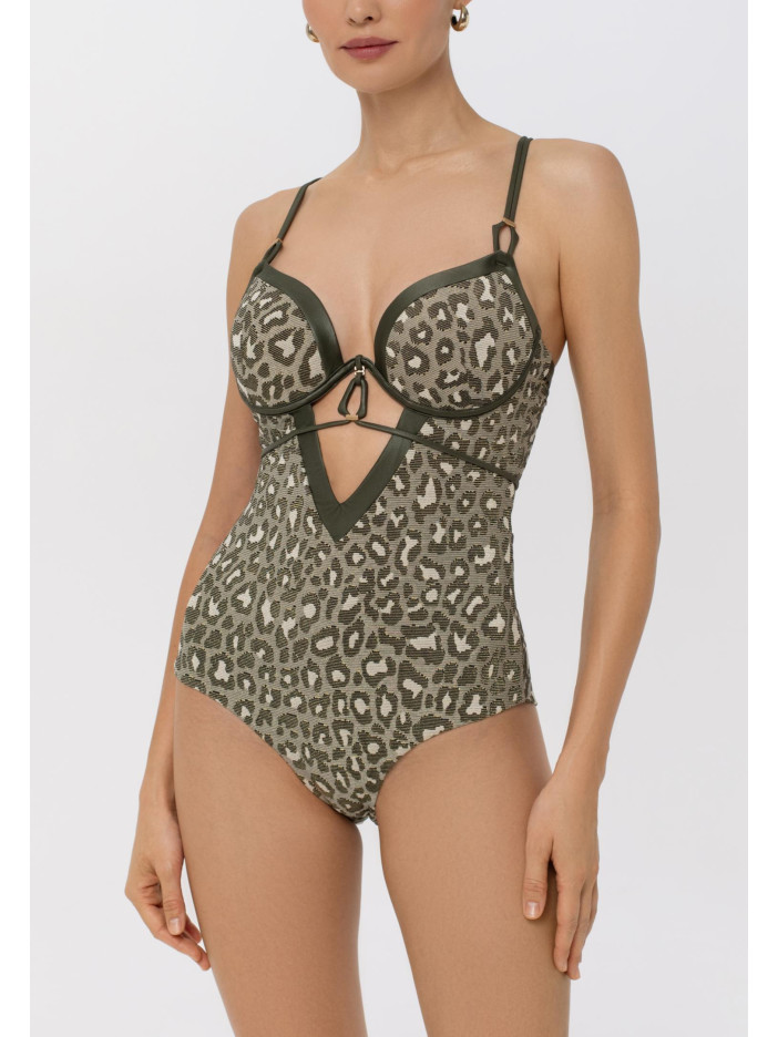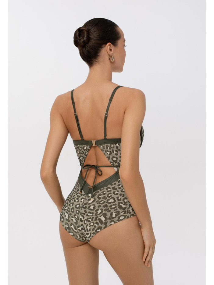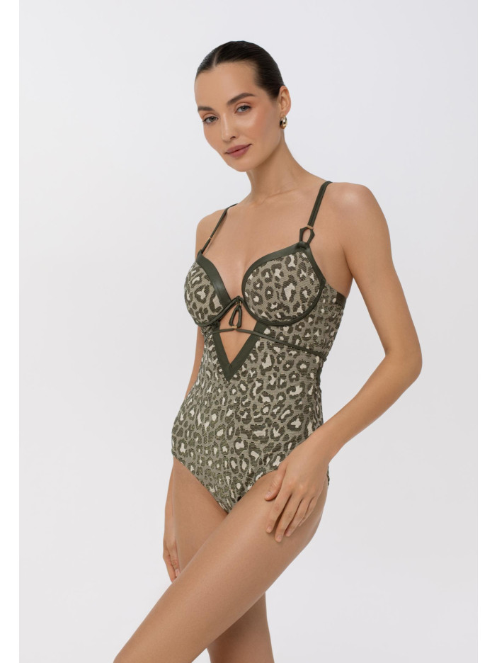 Без ограничений — впереди встреча с настоящей красотой! Серия APHRODITE с рельефным анималистичным орнаментом очаровывает с первого взгляда. Золотистая нить в структуре жаккарда, деликатное сияние шелковистой отделки и благородная палитра природных оттенков создают по-настоящему роскошный образ. Идеальный выбор для тех, кто хочет чувствовать себя богиней. Цельный купальник с формованными чашками и съёмными пуш-ап корректорами на монокаркасной поддержке подчёркивает формы, глубокий вырез декольте добавляет выразительности. Съёмный аксессуар с завязками на шее, регулируемые бретели-спагетти с декором и застёжка на спине обеспечивают комфорт и идеальную посадку. APHRODITE — воплощение женственности, силы и соблазна.