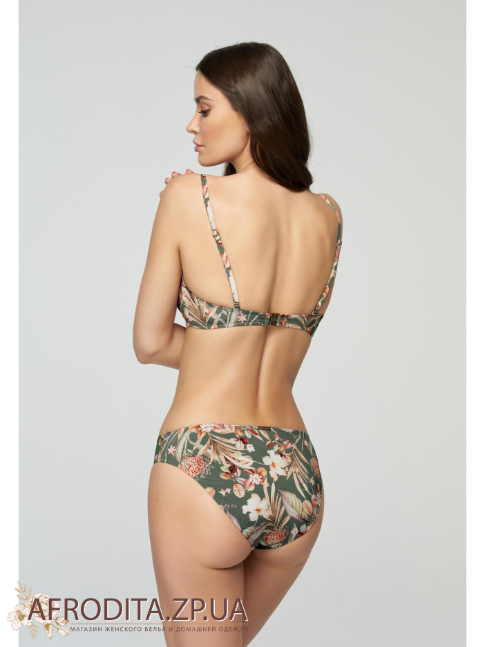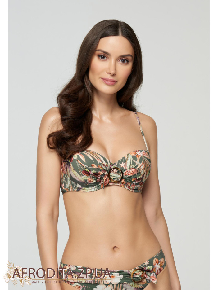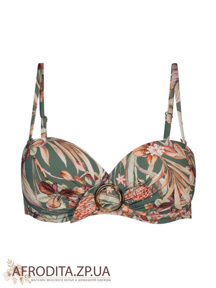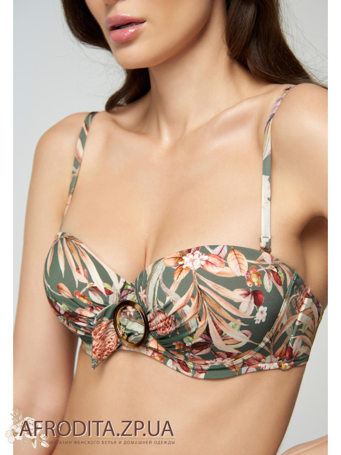 Верх купальника бандо на косточках с формованными чашечками. Съемные вкладыши пуш-ап приподнимают грудь. Благодаря силиконовой ленте по внутренней стороне выреза верх купальника плотно прилегает к телу. Съемные бретели регулируются по длине. На спине застежка. Декоративная пряжка спереди.