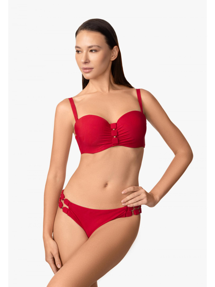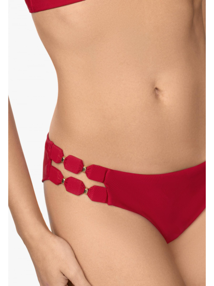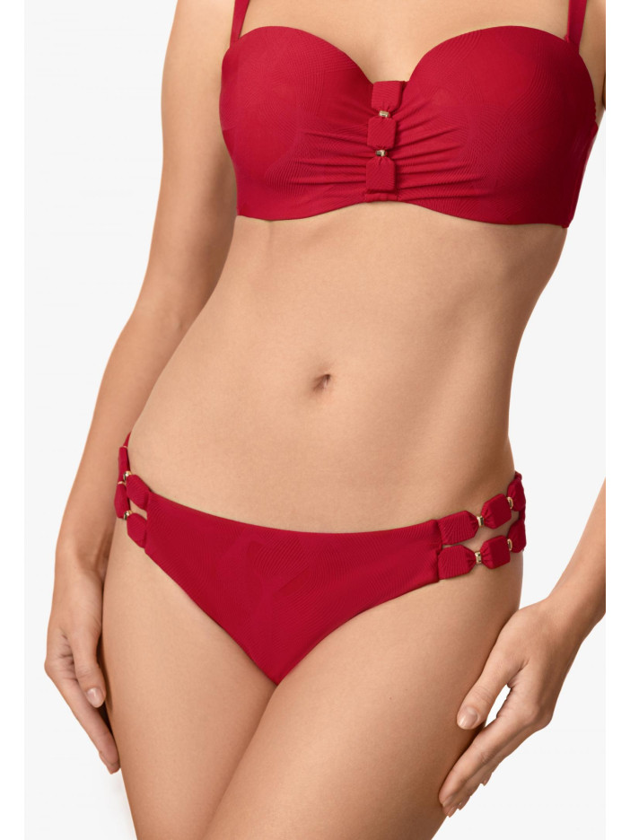 AURORA – энергия тяжести, воплощенная в ткани и цвете. Яркий красный жаккард как вспышка завораживает взгляд, оживляя силуэт и создавая эффектный, незабываемый образ. Декоративные прямоугольные элементы из основной ткани превращаются в архитектурные акценты, подчеркнутые изящными золотыми бусинами. Брифы со средней посадкой подчеркивают естественные линии фигуры и создают гармоничный силуэт. По бокам две эластичные фигурные вставки с аксессуарами придают современный акцент и визуально делают талию тоньше. Отделка задней детали в подворот с чистым краем.