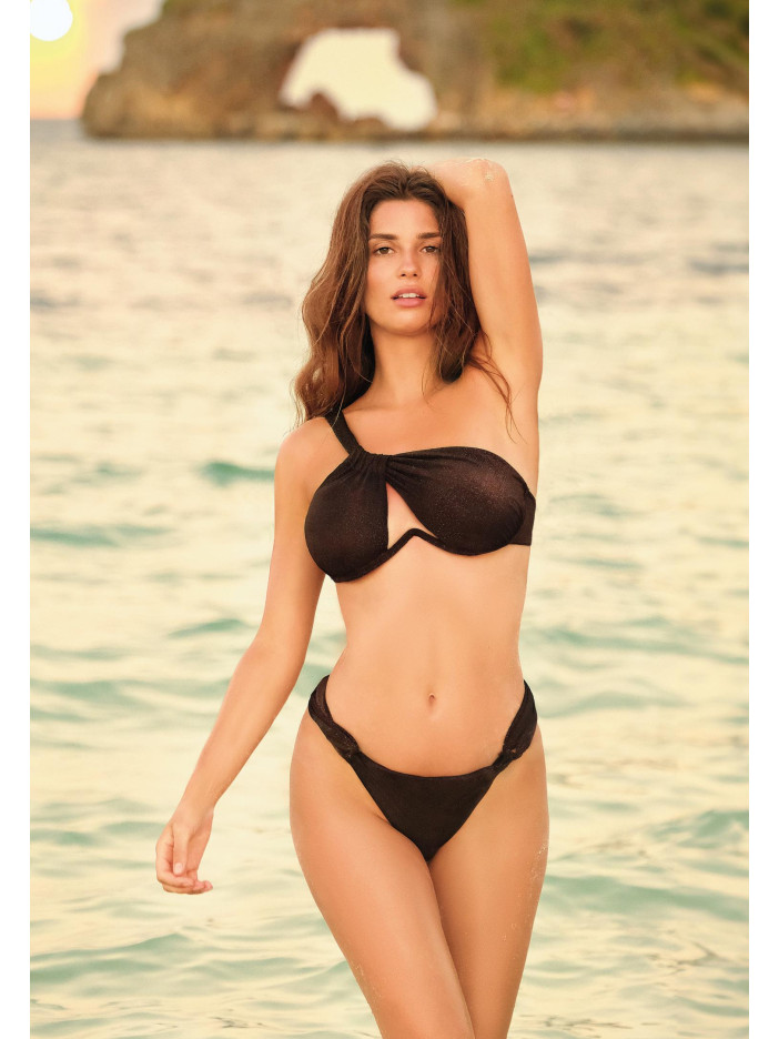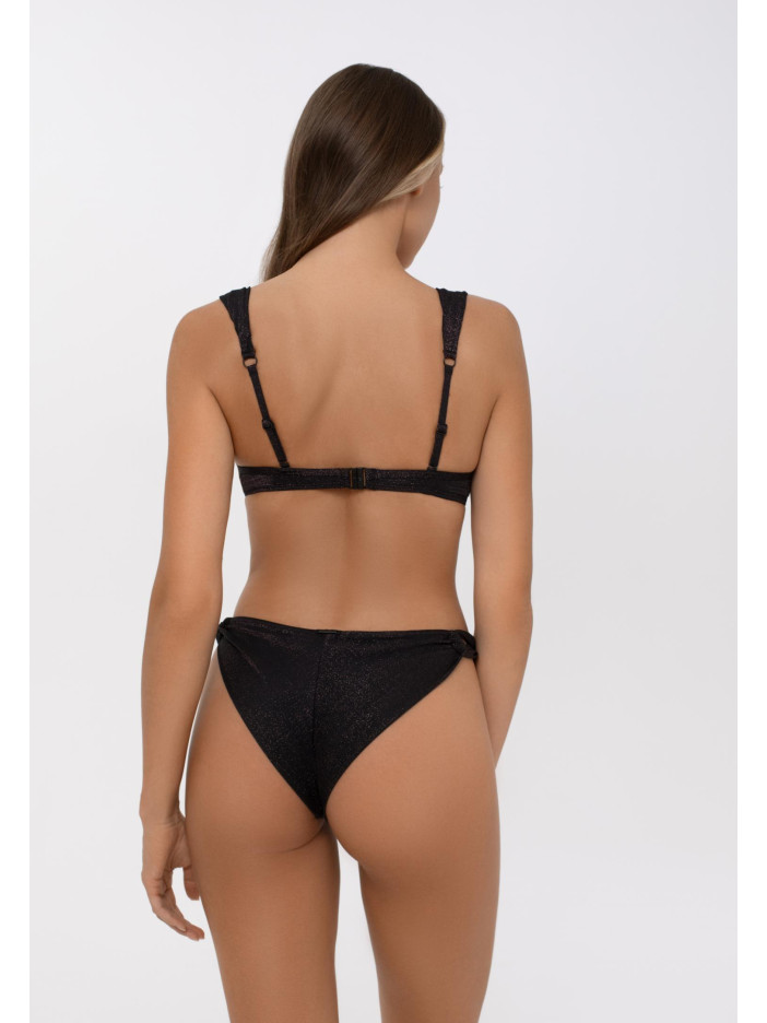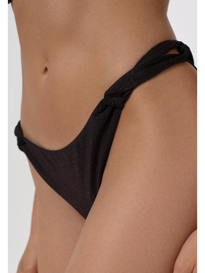 Ткань с металлизированной нитью Заниженная линия талии Декоративные перекруты по бокам Завышенный вырез по линии бикини Аккуратная обработка с чистым краем
