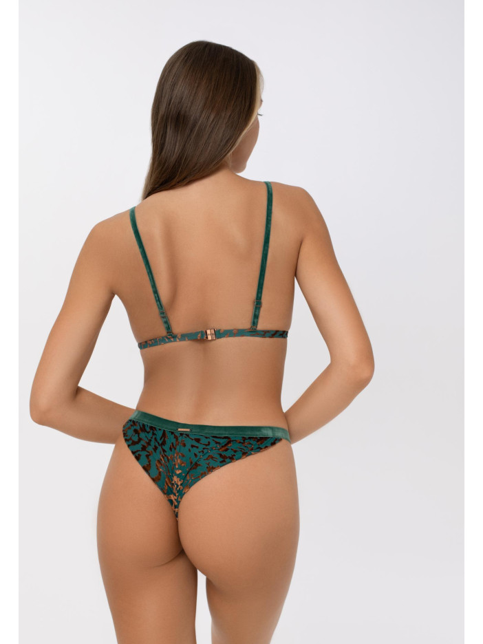 Бархатистая сияющая ткань Актуальные оттенки: тёмно-зелёный и ярко-медный Модель «бразилиана» с заниженной талией Вертикальный шов на задней детали Обработка края подворотом
