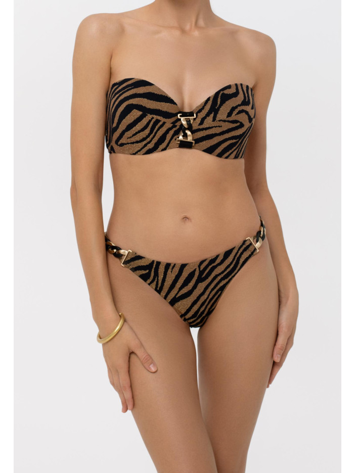 Хищный и притягательный — серия DARK GLOW создана, чтобы привлекать внимание. Объёмная текстура ткани, природные оттенки и изящная золотистая нить создают эффект глубины и мягкого сияния при любом освещении. Ультрамягкий эластичный материал идеально повторяет контуры тела, даря комфорт и уверенность. Плавки-бразиліана с заниженной талией подчёркивают фигуру, декоративные аксессуары по бокам добавляют стильный акцент, а вертикальный шов и аккуратный чистый край сзади формируют изящный силуэт. DARK GLOW — соблазнительный стиль и комфорт в каждой детали.
