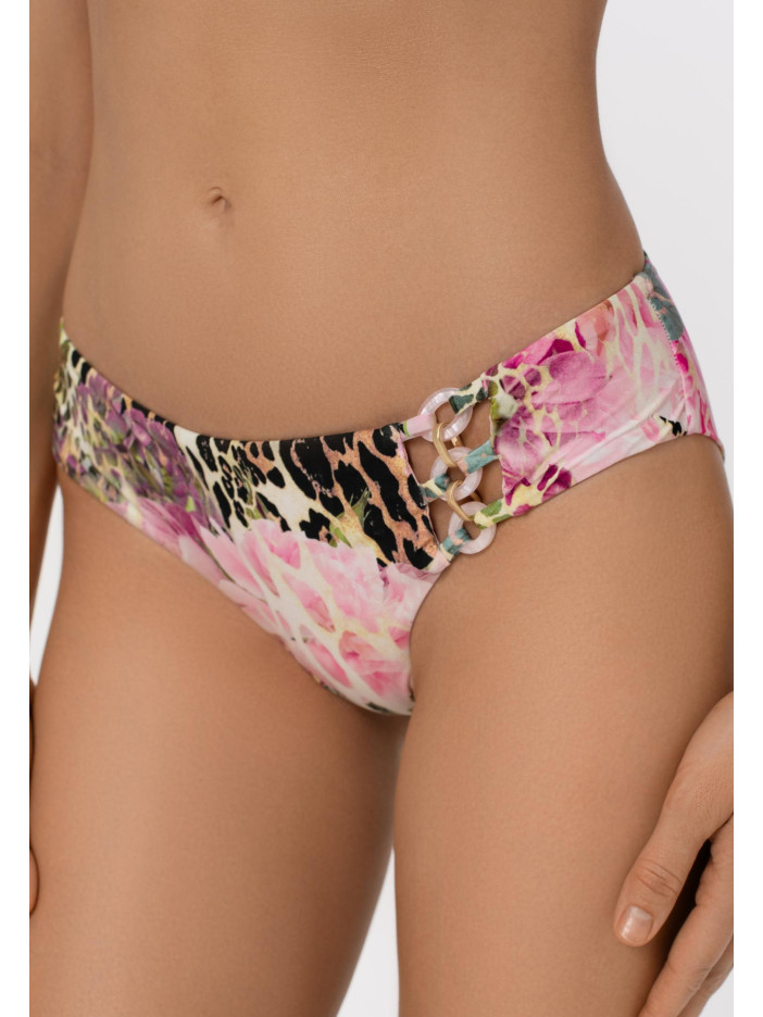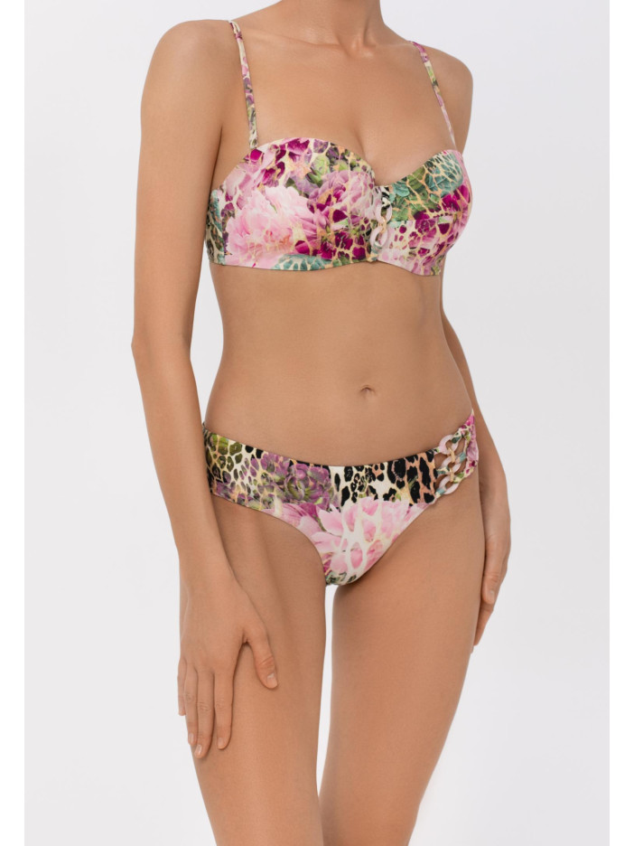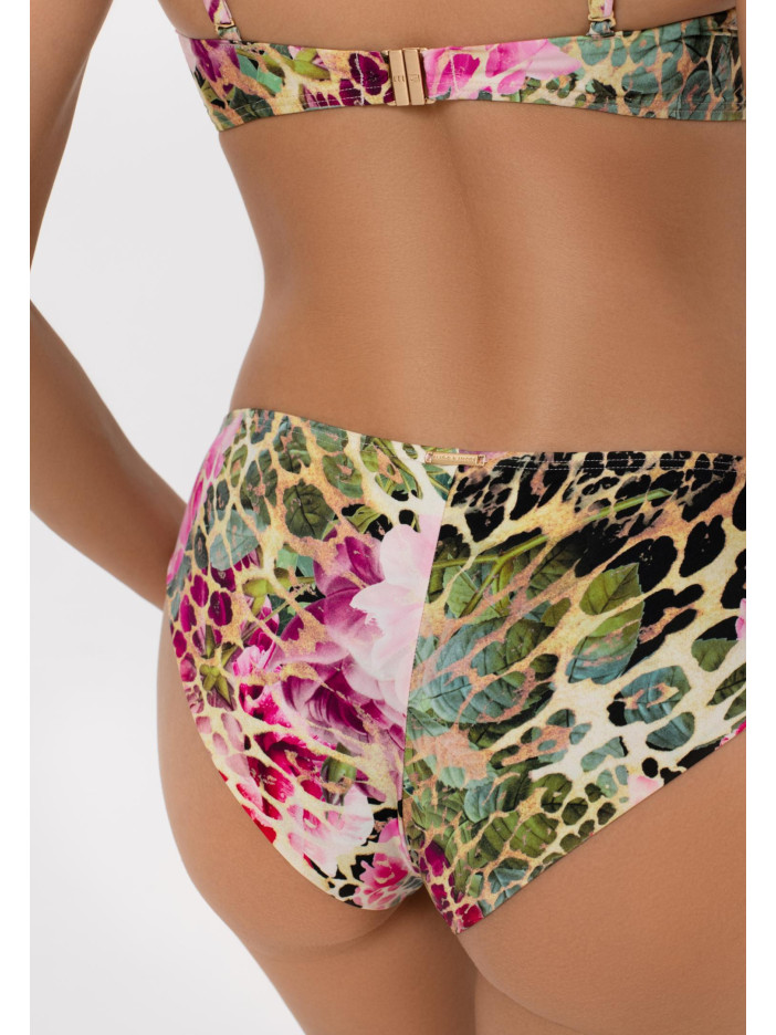 В серии FUSION эксклюзивный принт сочетает тропические цветы с леопардовым мотивом в многослойной композиции, создавая уникальный и стильный образ. Переливчатые оттенки розового, голубого, жёлтого и зелёного, дополненные нежными перламутровыми деталями, дарят атмосферу летнего отдыха и лёгкости. Ультраглянцевая поверхность ткани и высококачественная печать подчёркивают утончённость каждой детали. Плавки-бразиліана с средней линией талии удобно сидят и подчеркивают фигуру, вертикальный шов на задней части и чистый подворот делают образ завершённым и элегантным. FUSION — стиль, комфорт и летнее настроение в каждой детали.