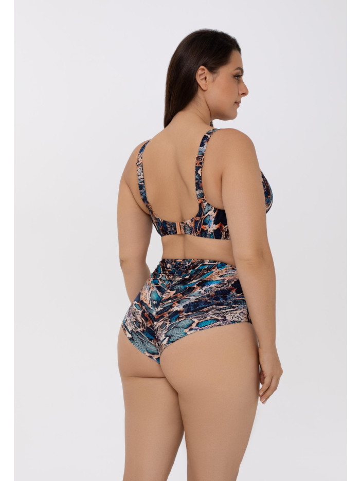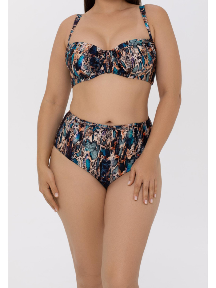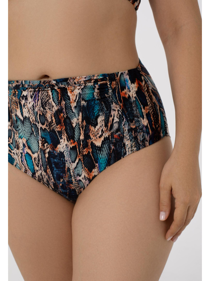 Бирюза и золото — роскошное и соблазнительное сочетание для летней серии SENSUAL SKIN. Анималистичный принт с эффектом кожи змеи в переливающихся бирюзовых, голубых и золотистых оттенках напоминает беззаботную красоту лагун и золотых пляжей. Гладкая ткань с сиянием и изысканные аксессуары в виде тонких косичек и цепочек цвета розового золота создают завораживающий 3D-эффект. Плавки-бразиліана с завышенной линией талии подчеркивают фигуру, тонкий декоративный пояс с аксессуаром на передней детали добавляет элегантности, а вертикальный шов и чистый подворот на задней части завершают образ. SENSUAL SKIN — стиль, комфорт и летнее настроение в каждой детали.