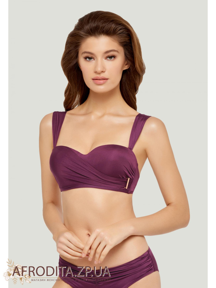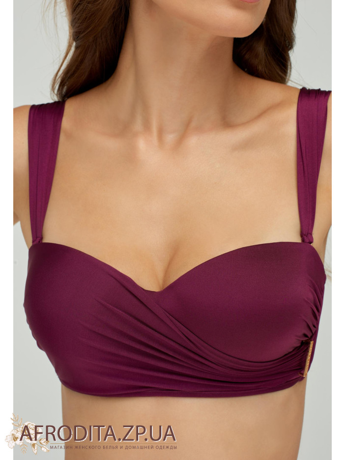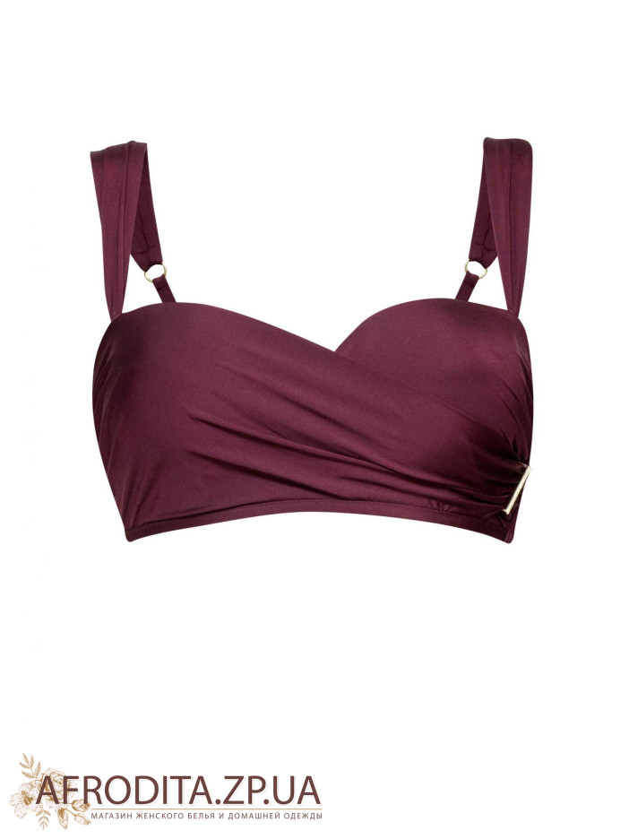 Формированная чашка "бандо" на каркасной поддержке со встроенным "пуш-ап". Асимметричная драпировка, сбоку есть металлический аксессуар. Широкие съемные бретели. На спине есть застежка.