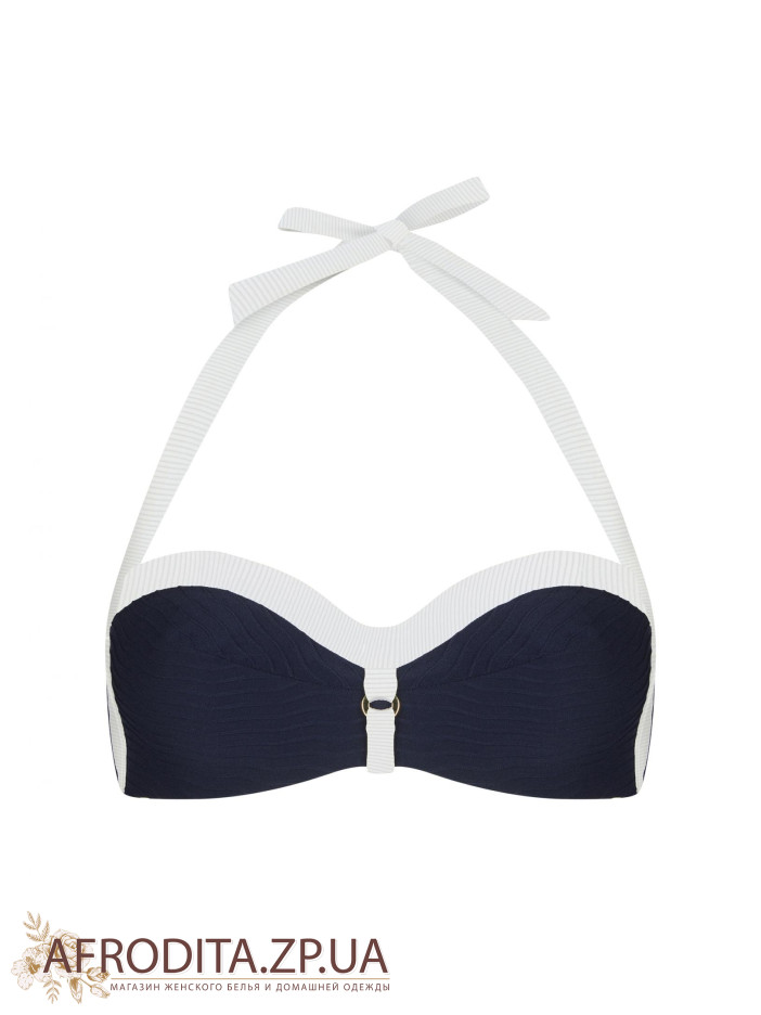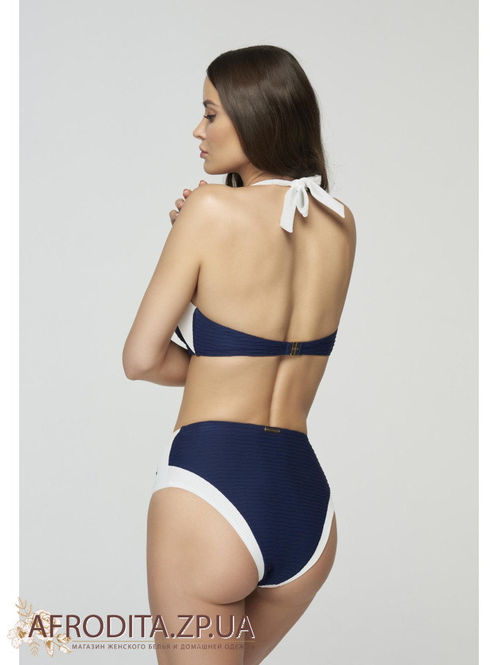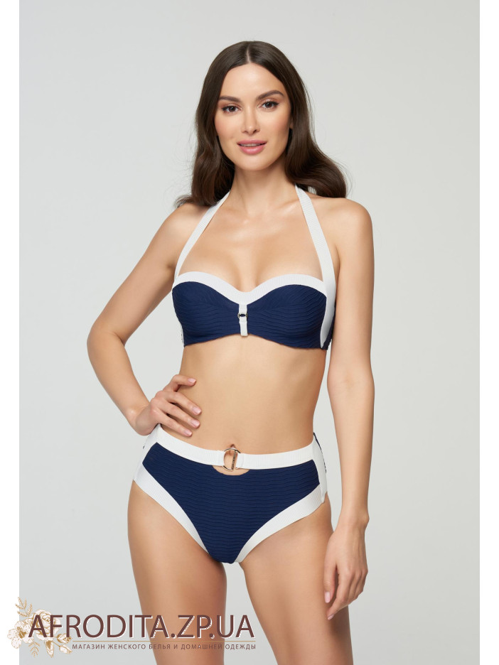 Верх купальника бандо со съемными вкладышами пуш-ап. Нижние и боковые косточки для лучшей поддержки. Широкие бретели халтер. На спине застежка. Женские плавки с высокой посадкой и классическим вырезом по линии бикини. Все детали продублированы подкладкой. Контрастная обработка на поясе и фирменная пряжка. Контрастная обработка по линии бикини зрительно удлиняет силуэт.