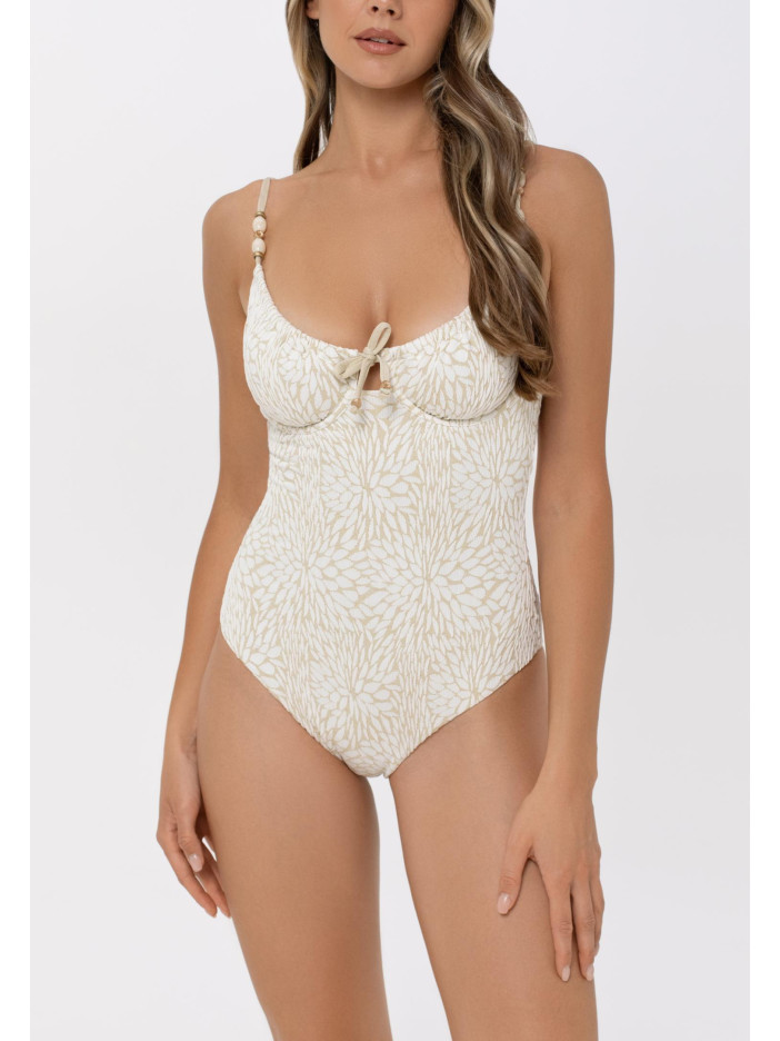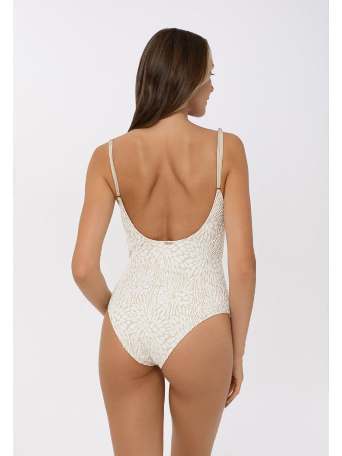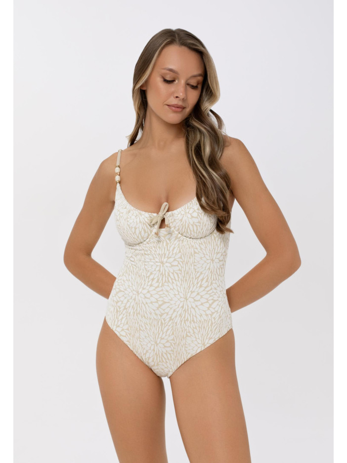 Цельный купальник с мягкой чашкой на косточках. Тонкие съёмные корректоры внутри. По линии декольте регулируемая кулиска. Лямки декорированы бусинами. Открытая спинка.