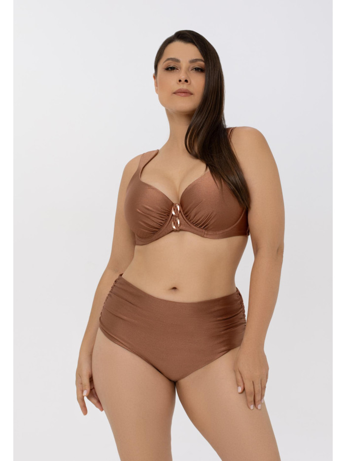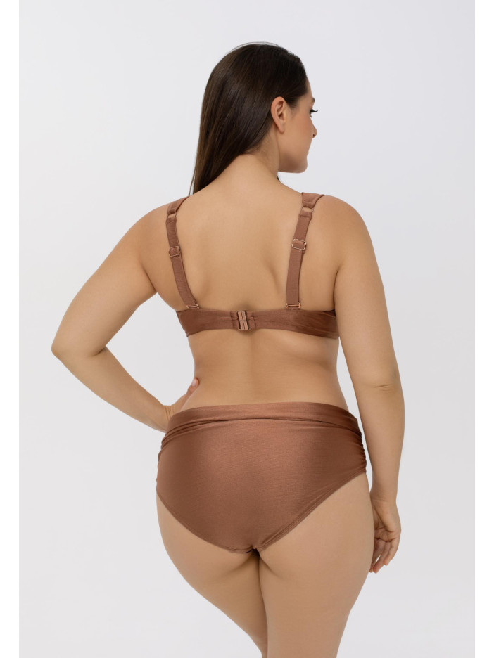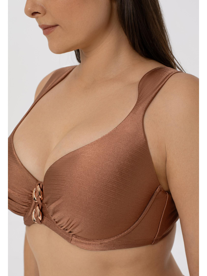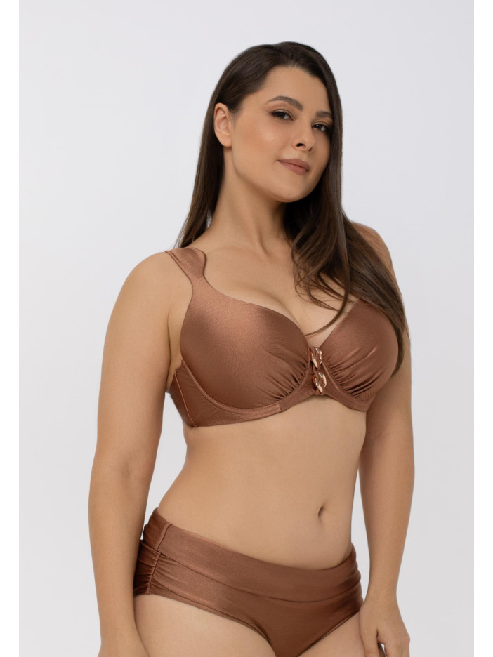 Мидный оттенок с мягким блеском Формованные чашки на косточках Подходит для пышных форм Погружённая линия декольте Аксессуар на поясе Широкие регулируемые бретели с поролоновой вставкой Застёжка на спине