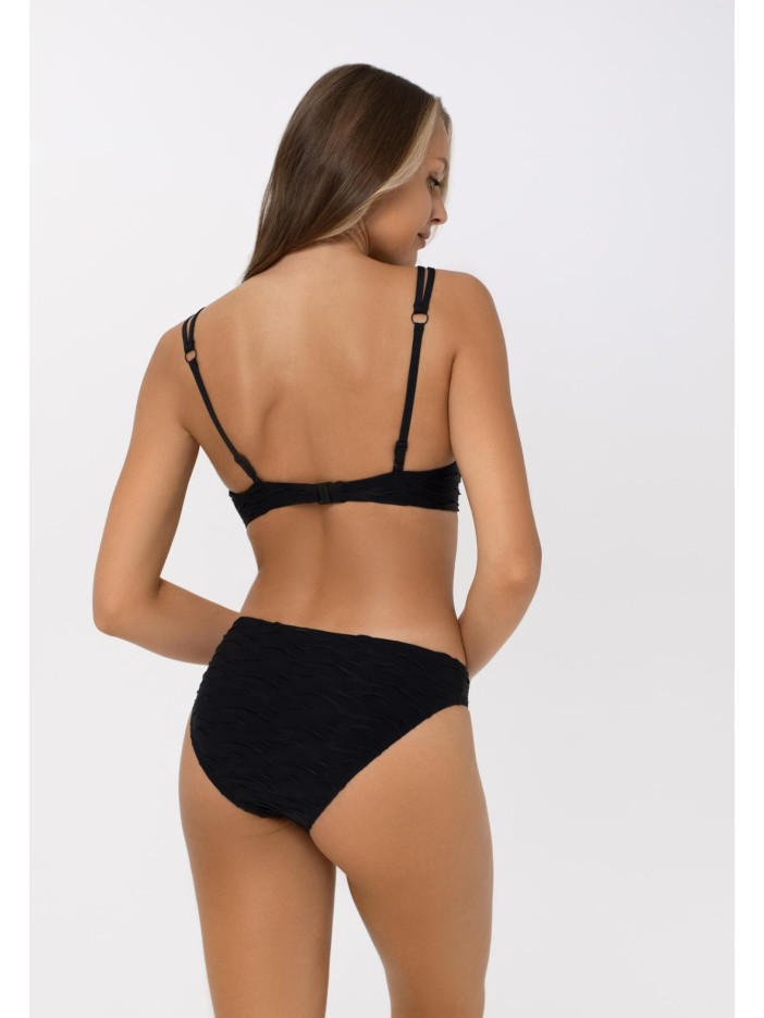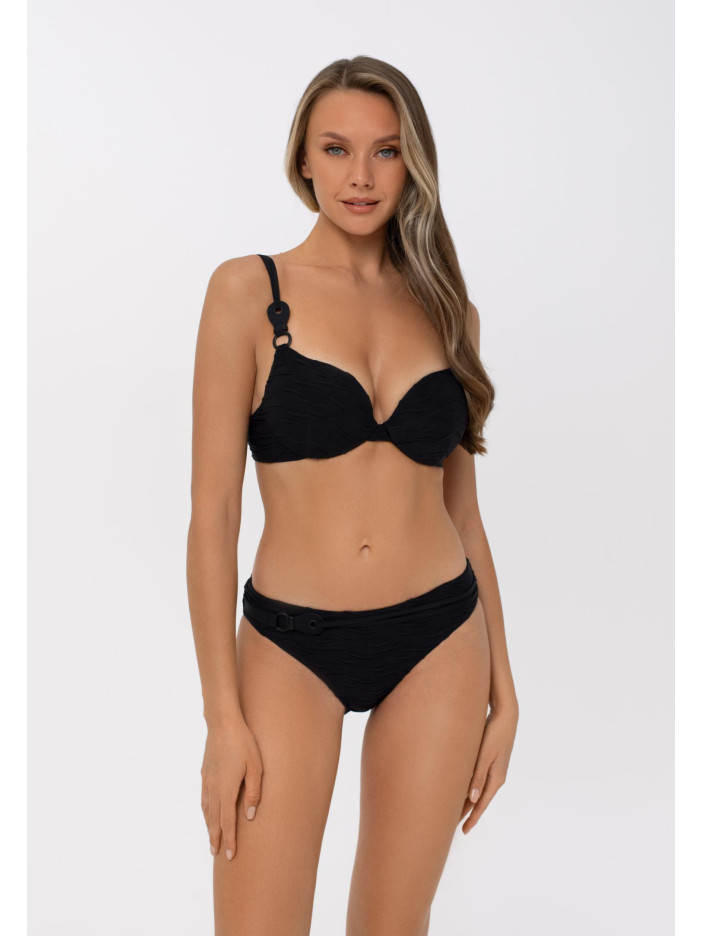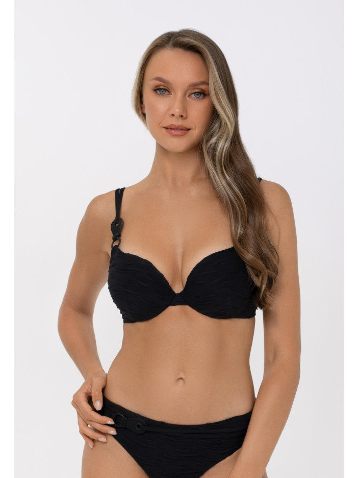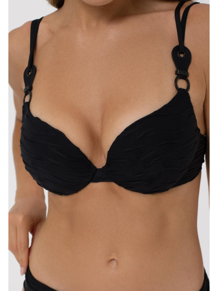 Вечная классика встречается с современным стилем в купальнике из серии FRENCH CODE «чёрное на черном»! Однотонная ткань с богатой текстурой украшена рельефными волнистыми жаккардовыми полосками, создавая соблазнительный и утончённый эффект, смарагдово-зелёная подкладка с сатиновым блеском и матовые чёрные аксессуары добавляют оригинальный акцент и делают морскую тематику многогранной. Верх купальника с формованными чашками и съёмными пуш-ап корректирующими вставками на косточках обеспечивает идеальную поддержку и соблазнительный силуэт, регулируемые бретели с декоративными элементами и застёжка на спине создают комфорт и уверенность в каждой детали.