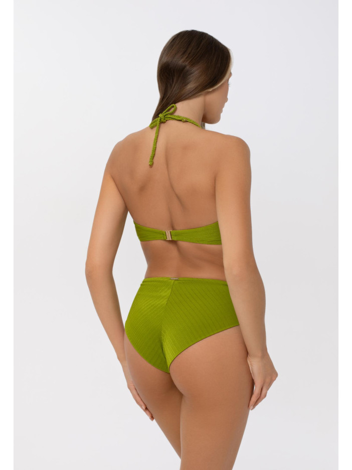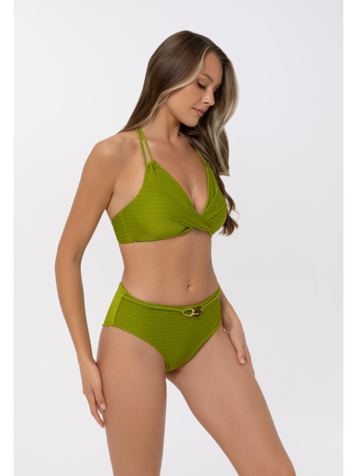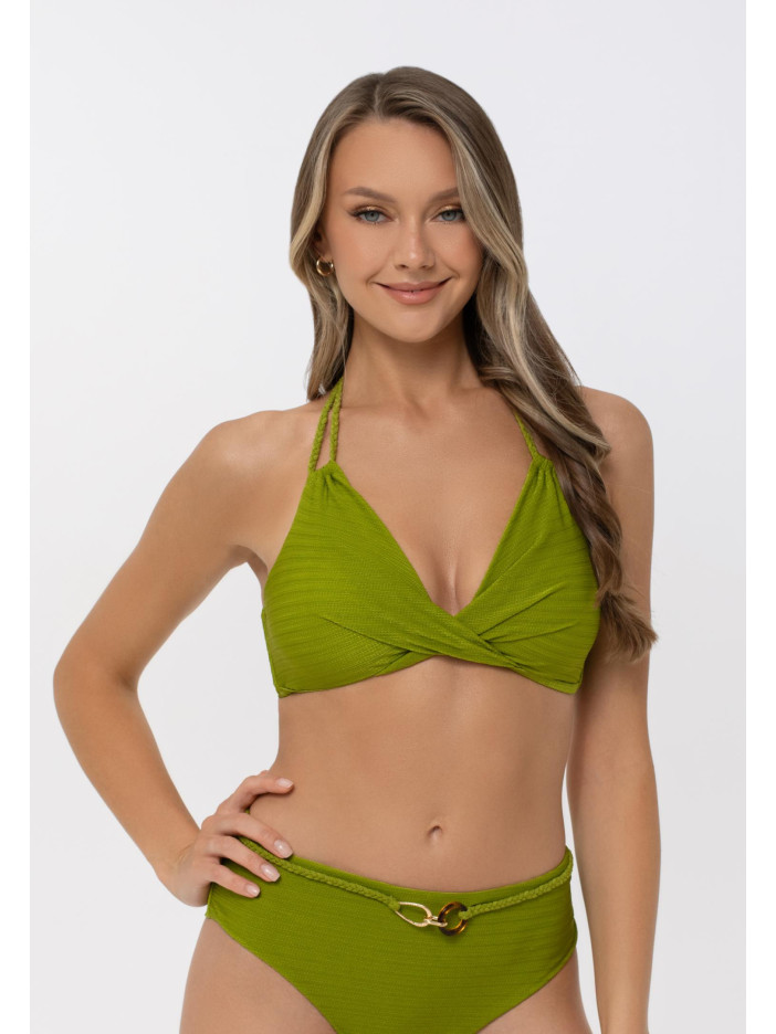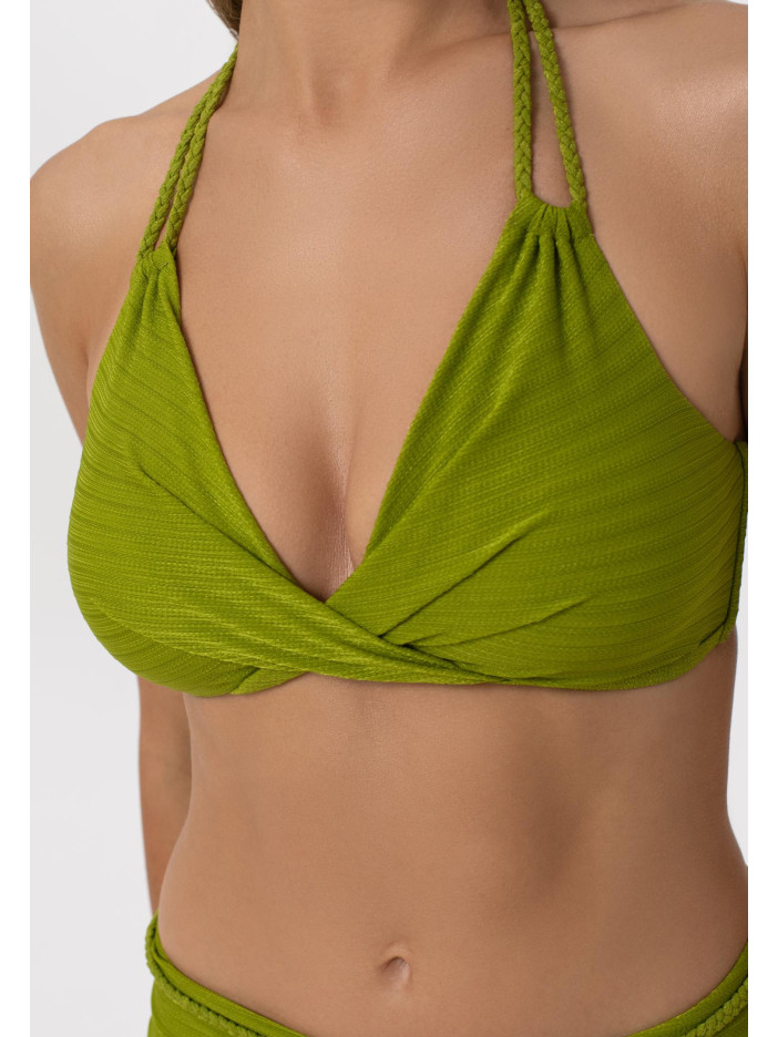 Верх купальника с мягкой треугольной чашкой и тонкими вшитыми корректирующими элементами. Спереди декоративный перекрут. Плетёные завязки-спагетти. Застёжка на спине.