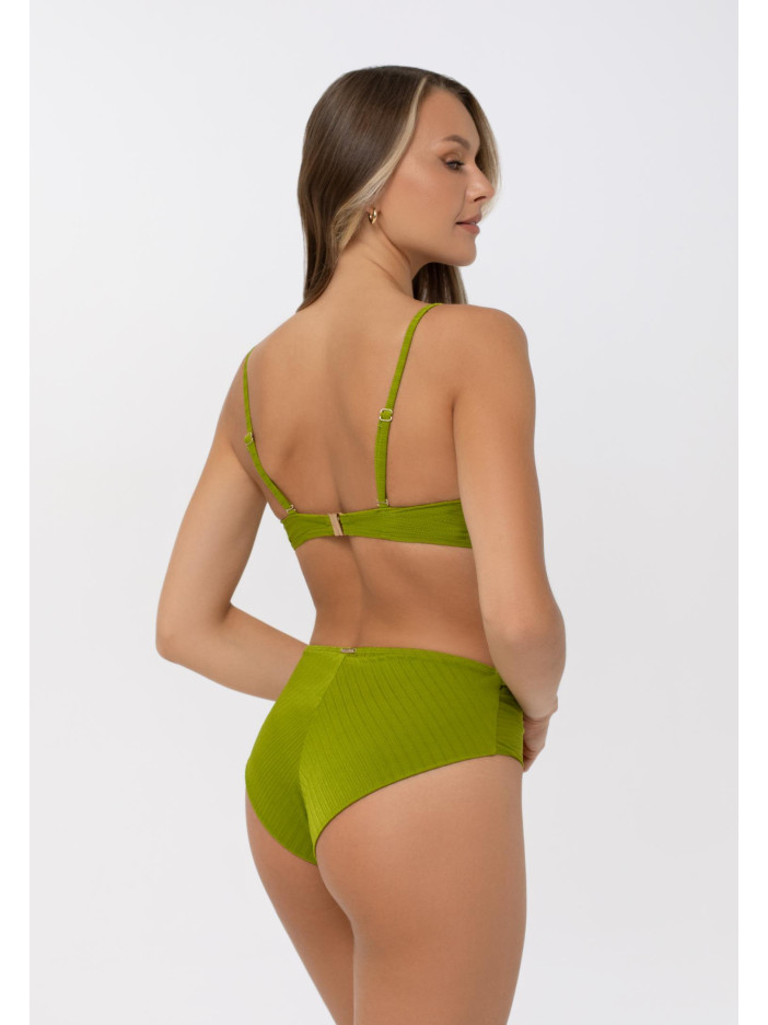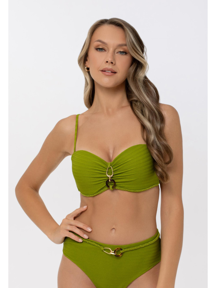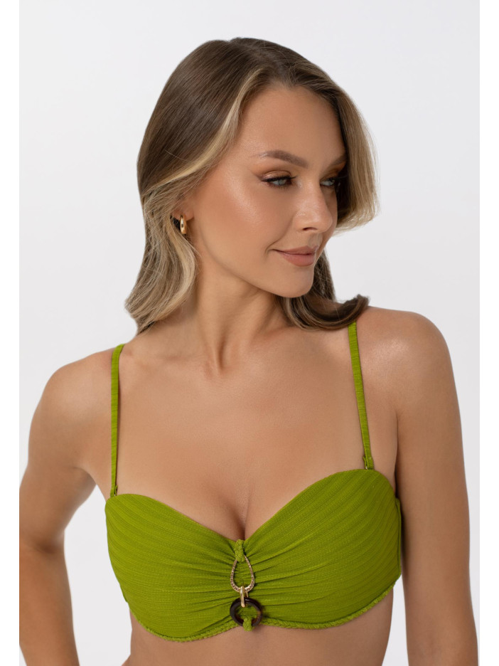Верх купальника с формованными чашками «бандо» на косточках. По центру декоративный аксессуар. Съёмные регулируемые бретели. Застёжка на спине.