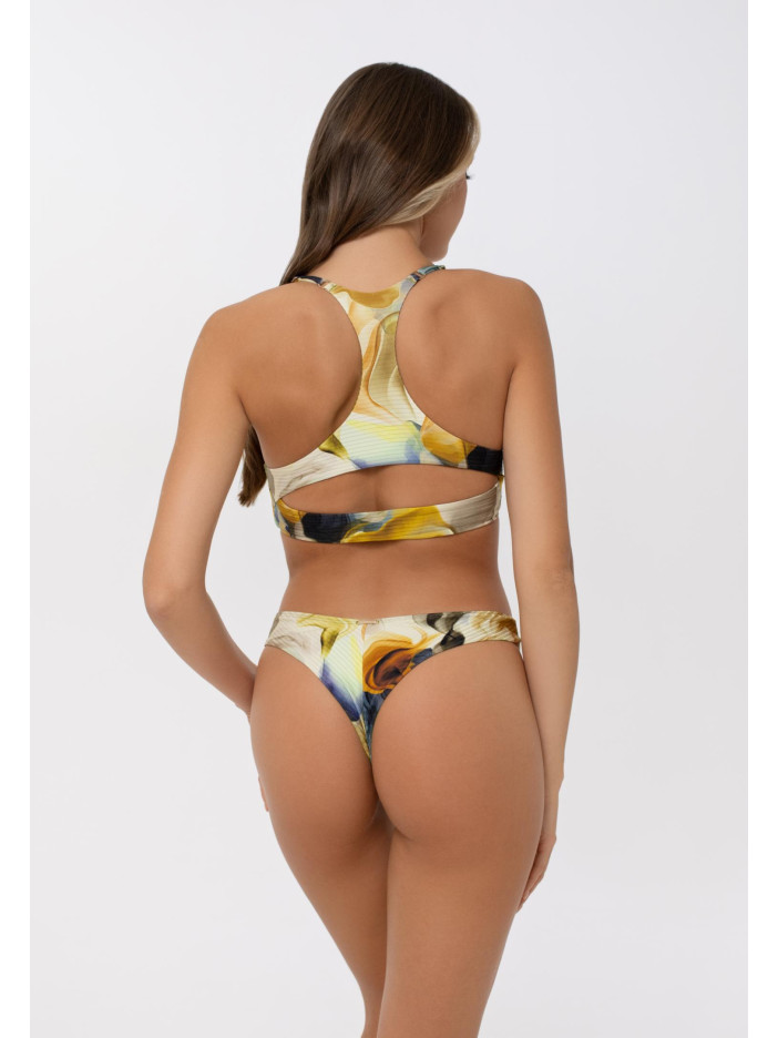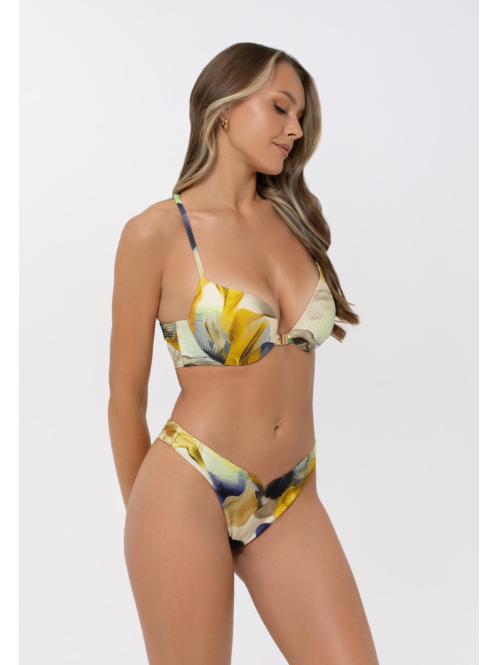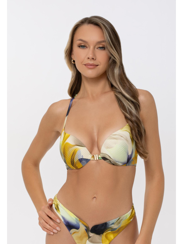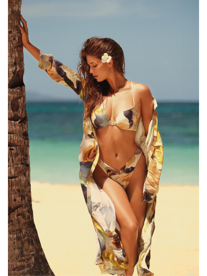 В полной гармонии с названием серии SYMPHONIE, эти модели отражают мягкое движение волн, создающих вечную морскую симфонию. В центре внимания — оригинальный принт, где оттенки плавно перетекают друг в друга в акварельной технике, создавая ощущение живой динамики. Полотном для этой акварели служит эластичный трикотаж с тонкой рубчатой текстурой, который нежно обволакивает фигуру. Сочетание полуспортовых элементов кроя и изящной линии декольте подчеркивает достоинства силуэта и обеспечивает визуальную гармонию. Верх купальника с формованными чашками с съемными корректирующими вставками «пуш-ап» на косточках. Застежка спереди между чашками. Спинка выполнена в спортивном стиле.