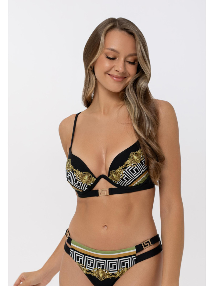 Геометрический орнамент в золотых тонах, вдохновлённый эпохой Барокко, создаёт утончённые узоры серии BAROQUE TWIST. Горчично-жёлтые и зелёные полосы на чёрном фоне подчёркивают контрастную роскошь ткани Jersey Lomellina от европейского производителя. Верх купальника с формованными чашками и съёмными корректирующими вставками «пуш-ап» на монокаркасной поддержке. Под грудью эластичная резинка с декоративным аксессуаром. Регулируемые бретели и застёжка на спине обеспечивают идеальную посадку. Эффектный «Placement» принт спереди добавляет уникальности образу.