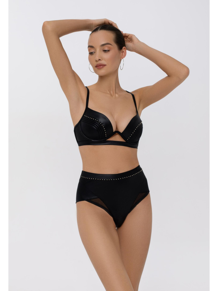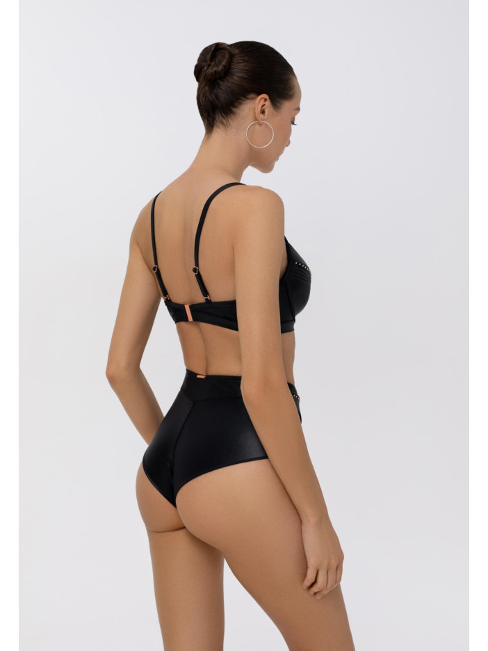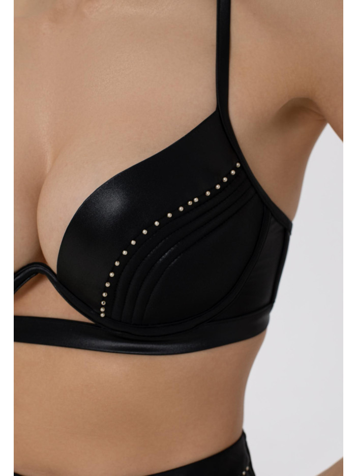 Верх купальника с формованными чашками со съёмными корректирующими вставками «push-up» на монокаркасной поддержке. Чашки спереди декорированы бусинами. Регулируемые бретели. Застёжка на спине.