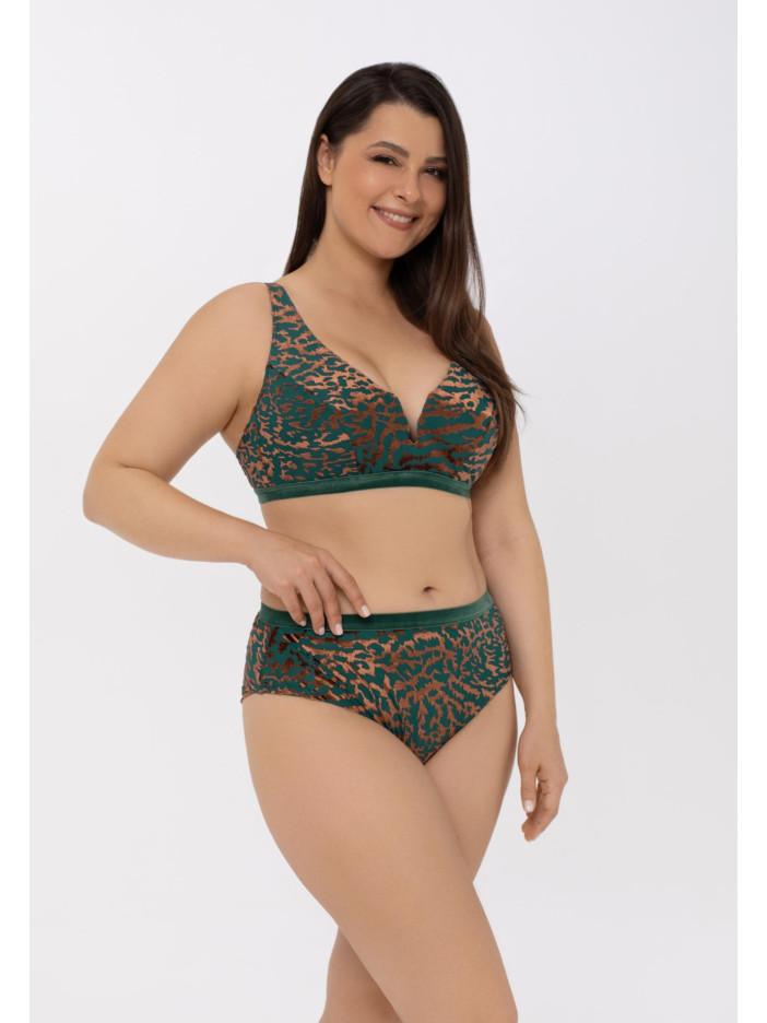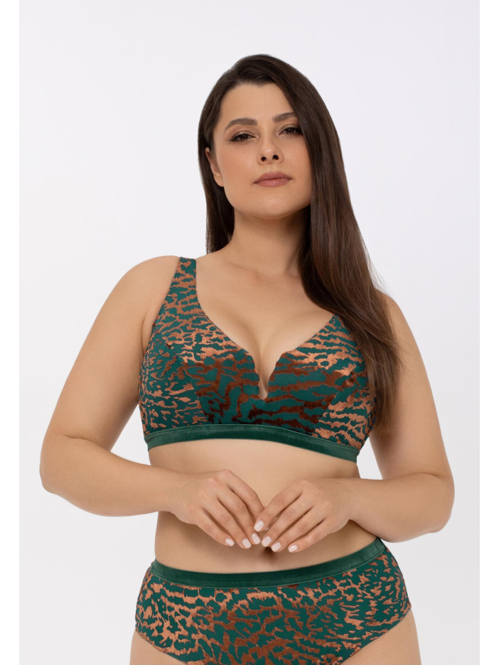 Бархатистая сияющая ткань Актуальные оттенки: тёмно-зелёный и ярко-медный Мягкая чашка на косточках с тонкими съёмными корректорами Подходит для пышных форм Погружённая линия декольте с фигурным вырезом Регулируемые бретели Застёжка на спине