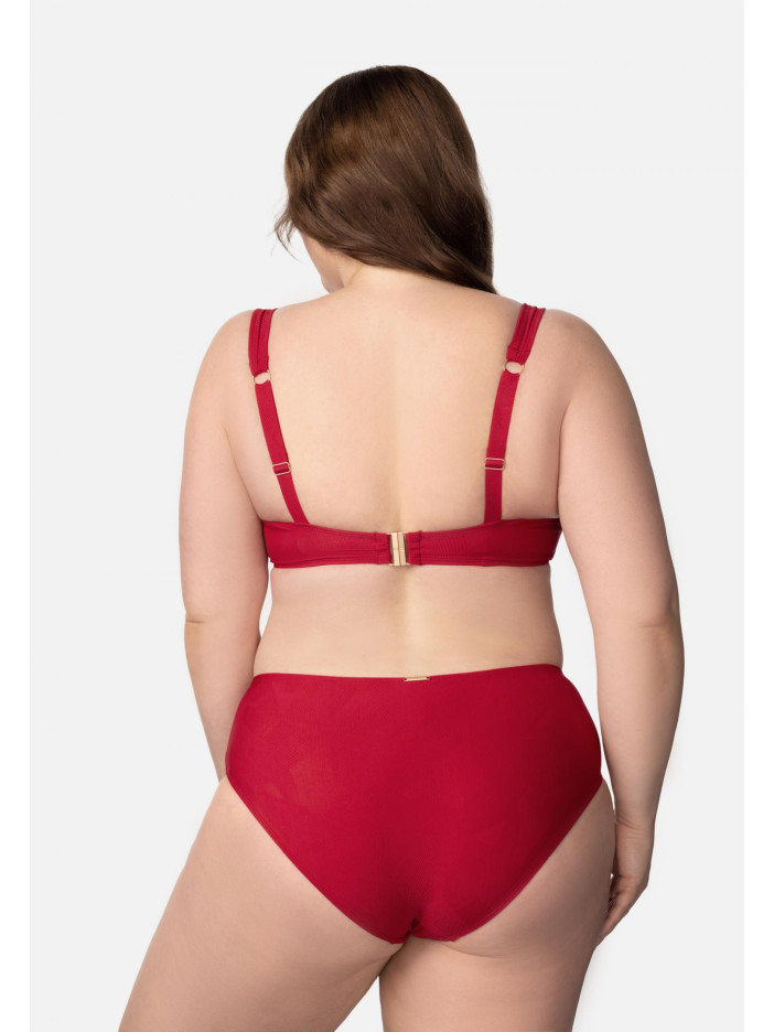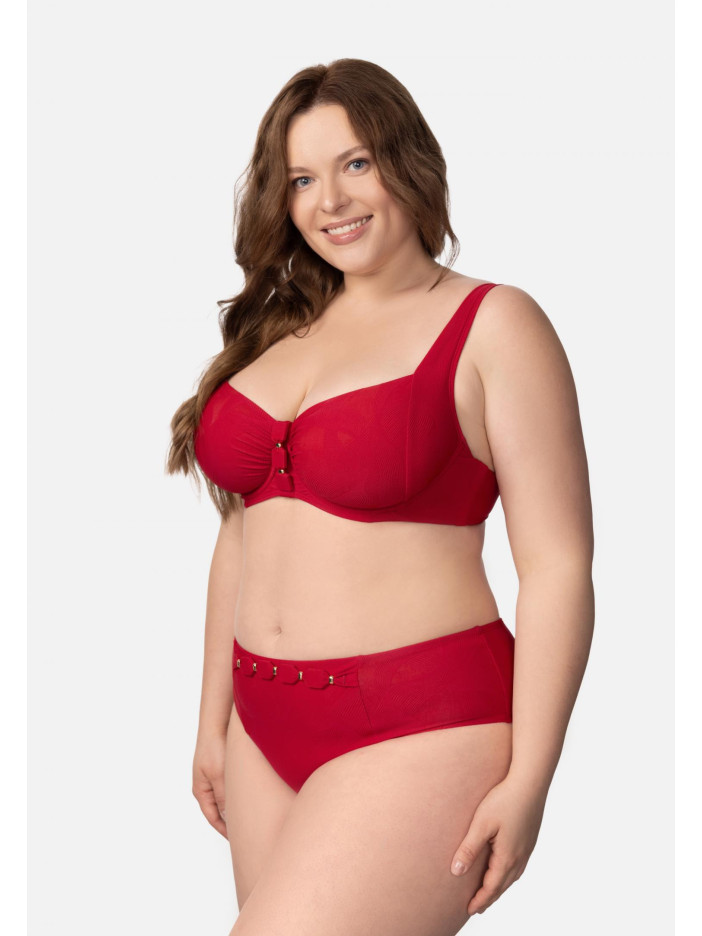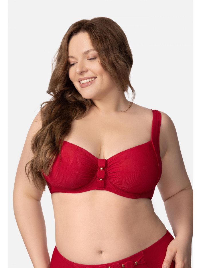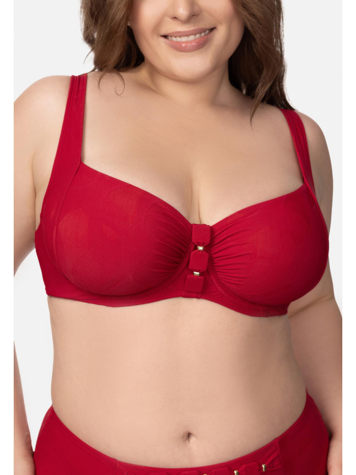 AURORA – энергия тяжести, воплощенная в ткани и цвете. Яркий красный жаккард как вспышка завораживает взгляд, оживляя силуэт и создавая эффектный, незабываемый образ. Декоративные прямоугольные элементы из основной ткани превращаются в архитектурные акценты, подчеркнутые изящными золотыми бусинами. Мягкая чашка на каркасной поддержке, дублированная эластичной сеткой, обеспечивает дополнительную поддержку и комфорт. Аксессуар по центру между чашками придает изысканный акцент и подчеркивает линию декольте. Широкие регулируемые бретели и застежка на спине гарантируют идеальную посадку и удобство при движении.