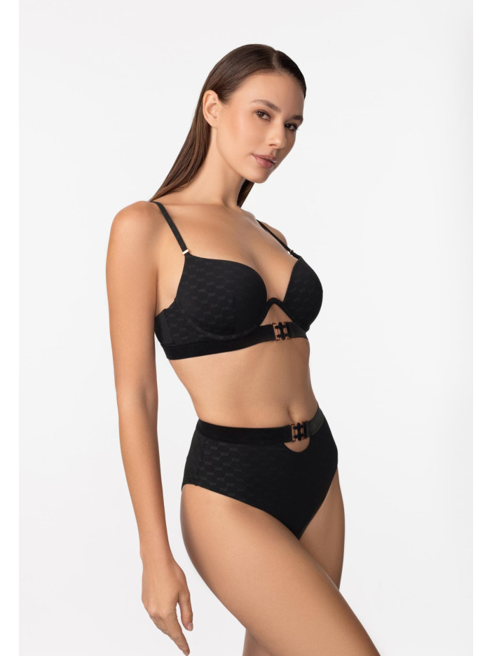 Изысканная роскошь и безупречная женственность — купальник из жаккардовой серии LUXURY FRAGRANCE от Marc & André создан, чтобы притягивать взгляды. Элегантный черный цвет в сочетании с фирменным логотипом и бархатными вставками формирует стильный и утончённый образ вне времени. Инновационная подкладка с микрокапсулами, содержащими экстракт чайного дерева, бережно ухаживает за кожей, обеспечивая ощущение свежести и комфорта. Формованная чашка с съёмными корректорами push-up на монокаркасной основе красиво подчеркивает линию декольте и обеспечивает надежную поддержку. Эластичный пояс под грудью из мягкого бархата с декоративной пряжкой добавляет акцент роскоши, а регулируемые бретели и удобная застёжка на спине позволяют добиться идеальной посадки.