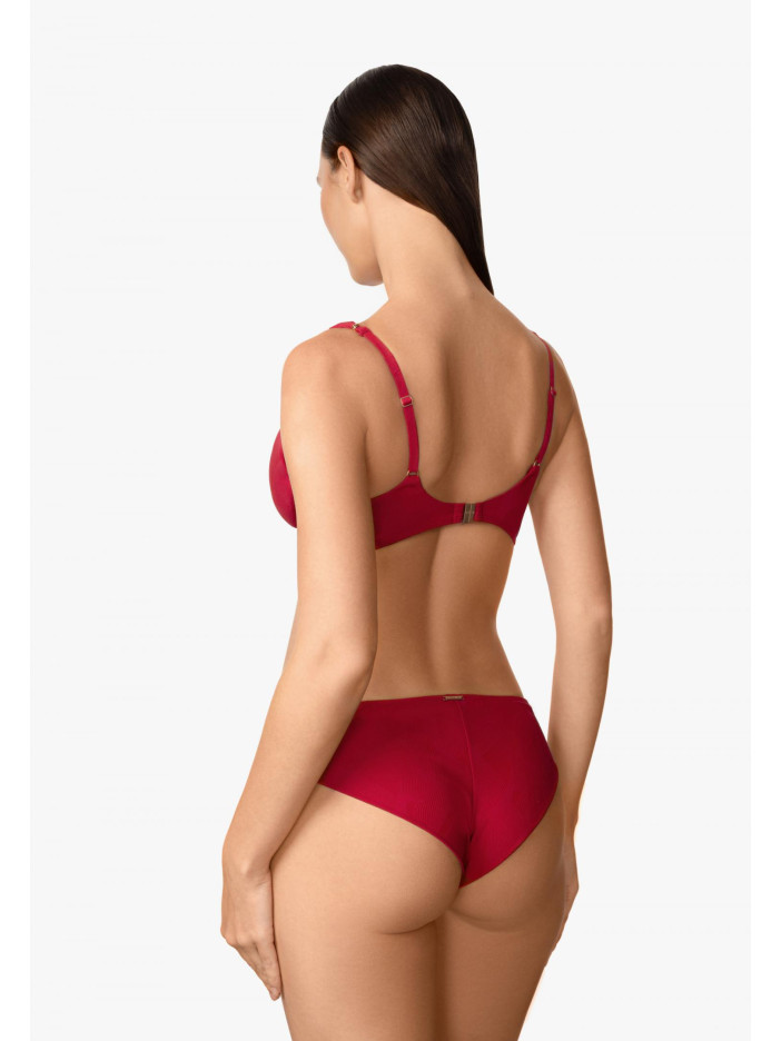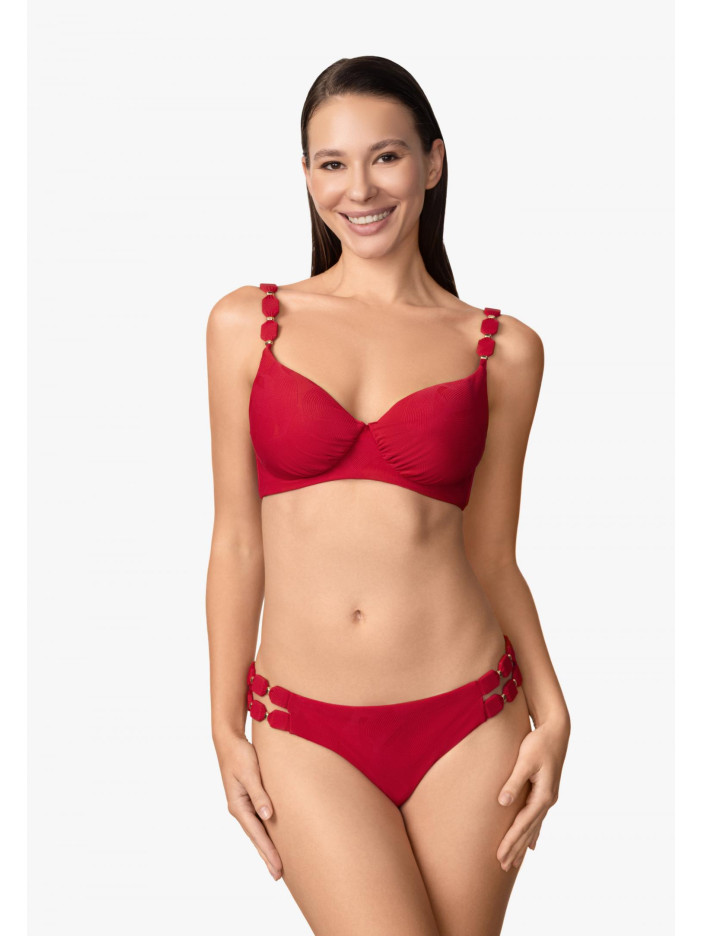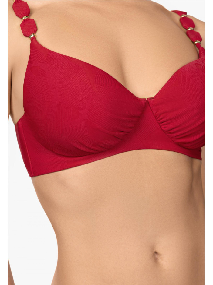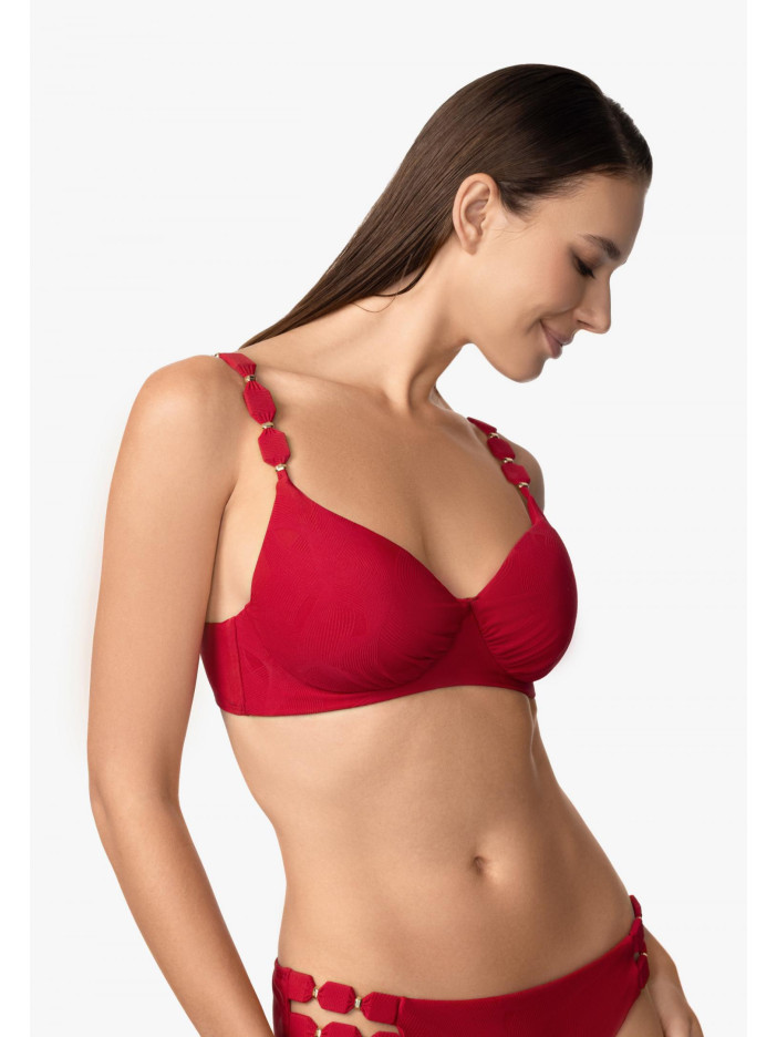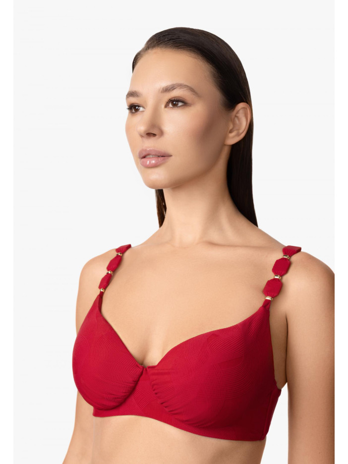 AURORA – энергия тяжести, воплощенная в ткани и цвете. Яркий красный жаккард как вспышка завораживает взгляд, оживляя силуэт и создавая эффектный, незабываемый образ. Декоративные прямоугольные элементы из основной ткани превращаются в архитектурные акценты, подчеркнутые изящными золотыми бусинами. Мягкая чашка с тонкими съемными корректорами Spacer обеспечивает легкую поддержку и аккуратный силуэт. Каркасная поддержка гарантирует комфорт и надежную фиксацию. Регулируемые бретели, декорированные аксессуарами, придают изящный акцент, а застежка на спине обеспечивает идеальную посадку.