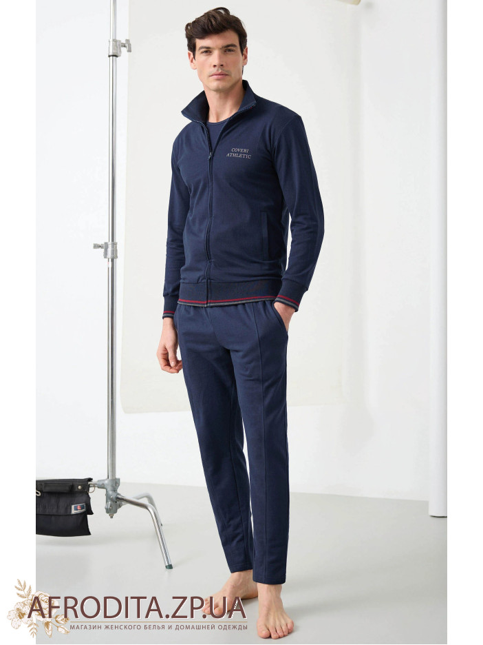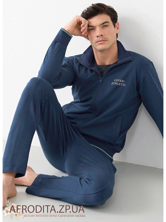 Домашний мужской костюм на молнии Enrico Coveri EA2067. Модель состоит из кофты на молнии темно-синего цвета с длинным рукавом, слева на груди в качестве декора расположенная надпись "Coveri Athletic". Края рукавов обработаны манжетами и украшены контрастным кантом. Брюки также темно-синего цвета прямого кроя на резинке, по бокам есть карманы. Костюм выглядит стильно и презентабельно, хороший подарок близкому вам человеку.