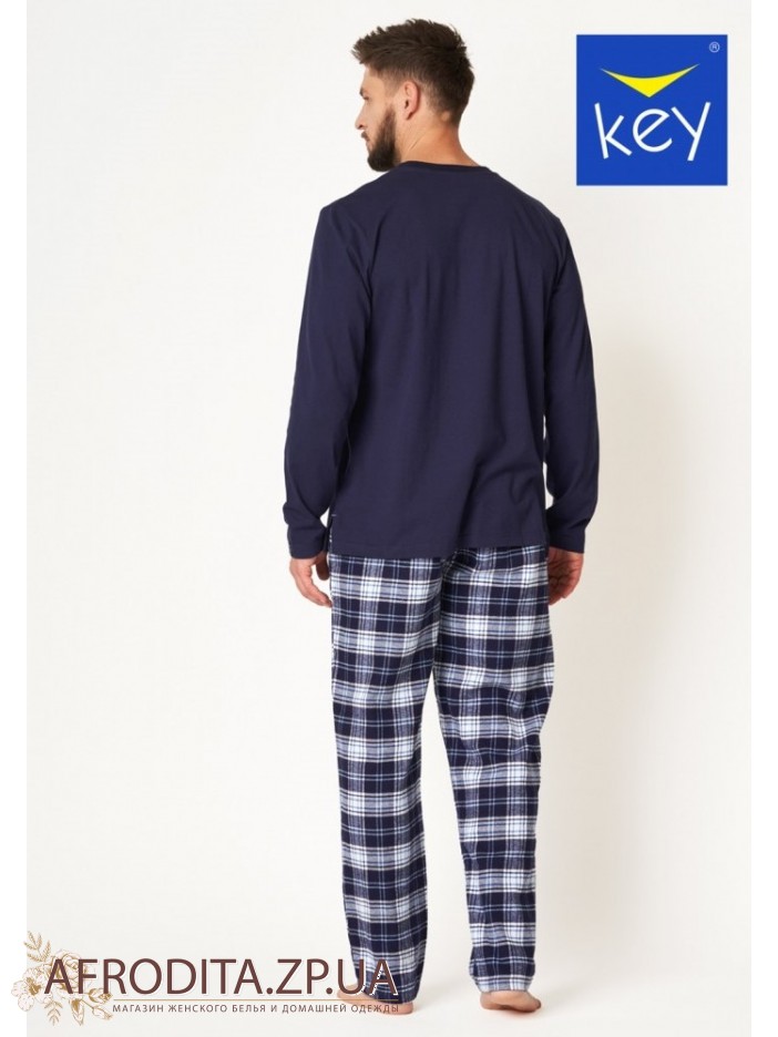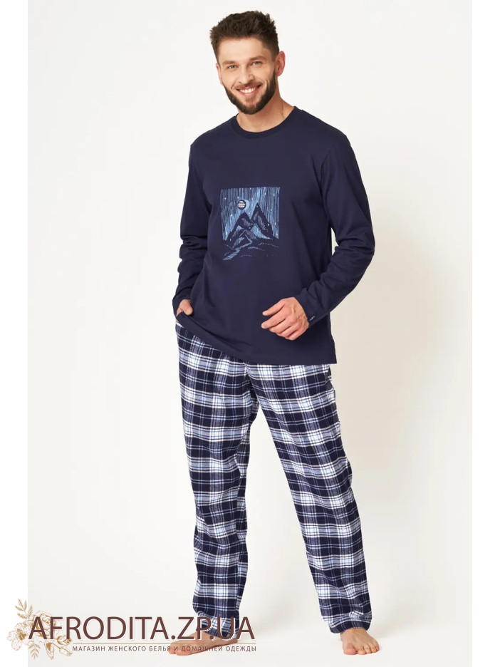 Мужская пижама с брюками MNS 412 B24 изготовленная из натурального хлопка. Комплект состоит из джемпера темно-синего цвета с длинным рукавом и штанов прямого кроя в шотландскую клетку.