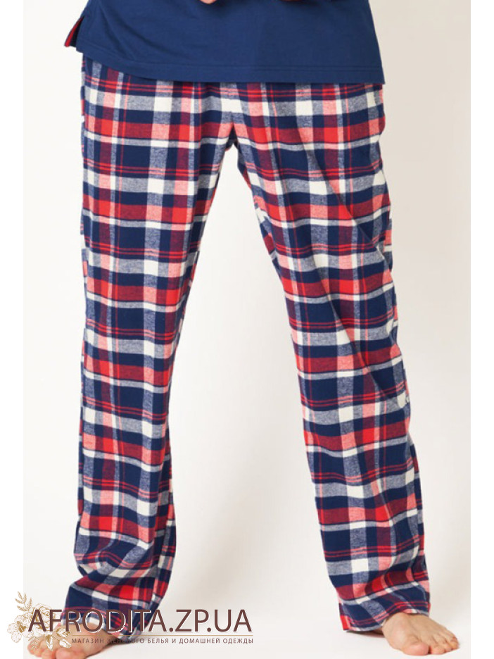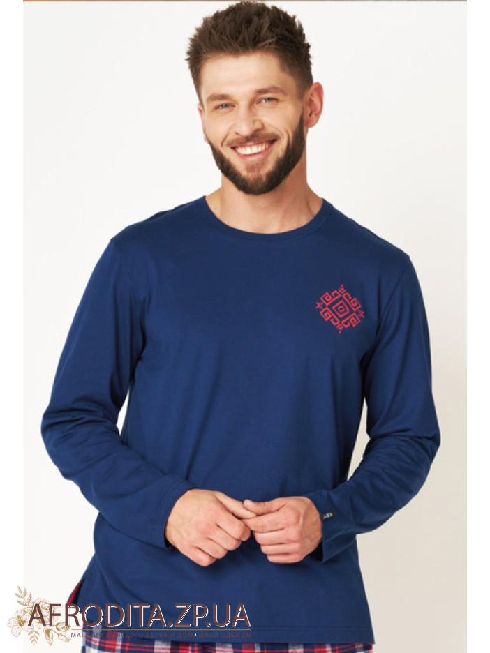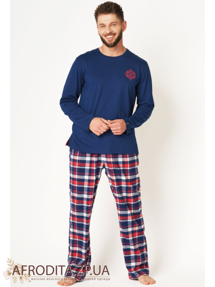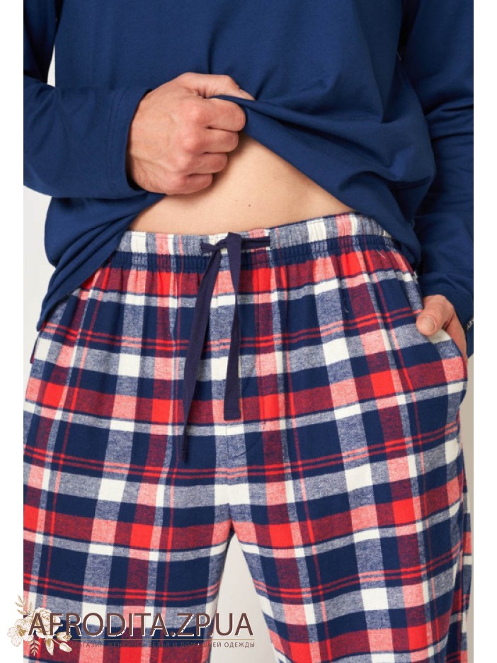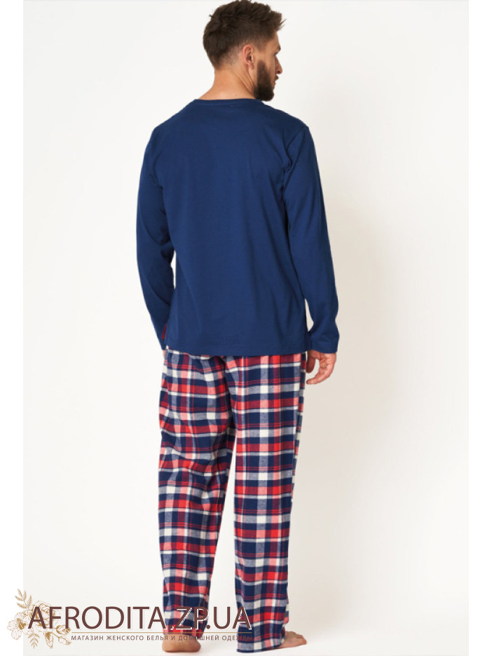 Мужская пижама со штанами MNS 613 B24 из хлопка. Комплект состоит из джемпера с длинными рукавами темно-синего цвета и и штанов на резинке прямого кроя.