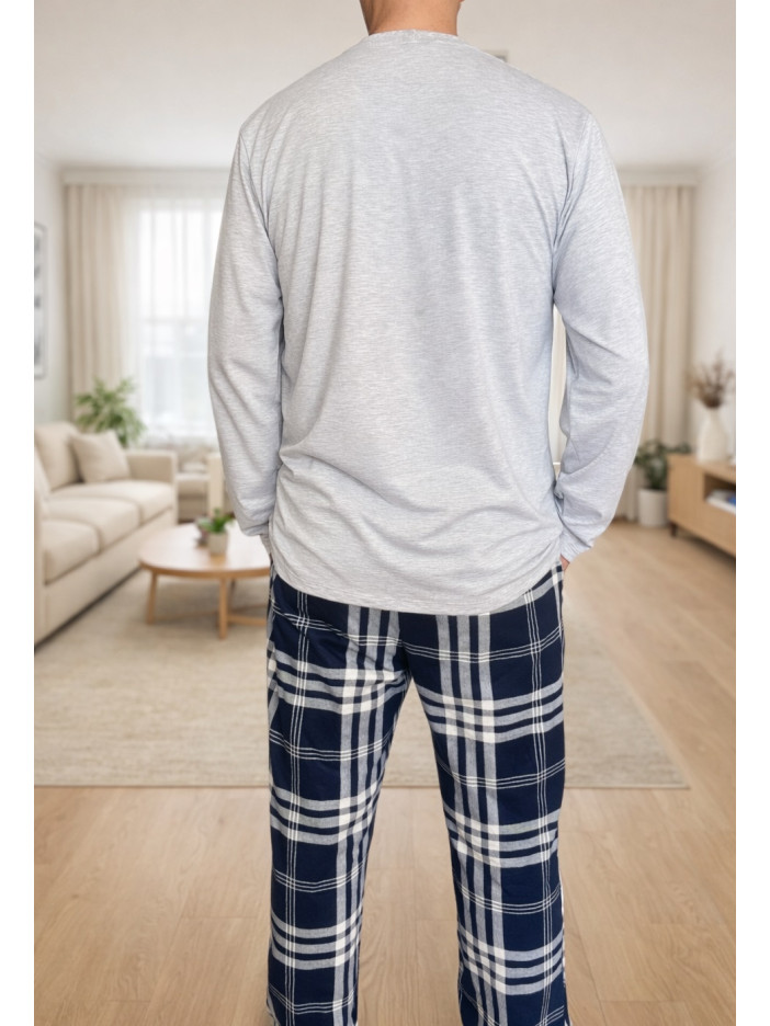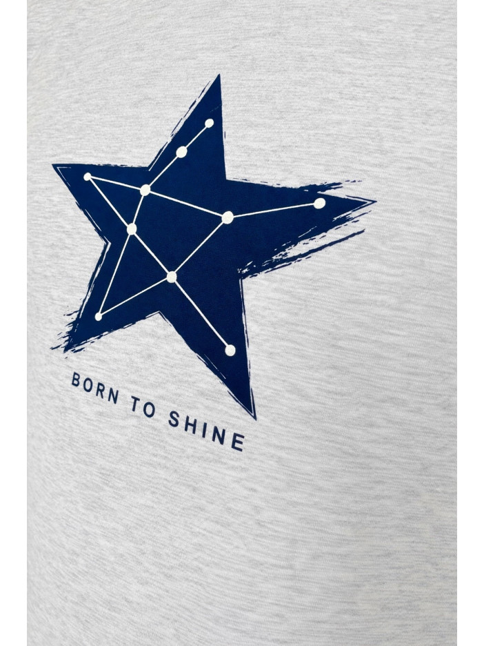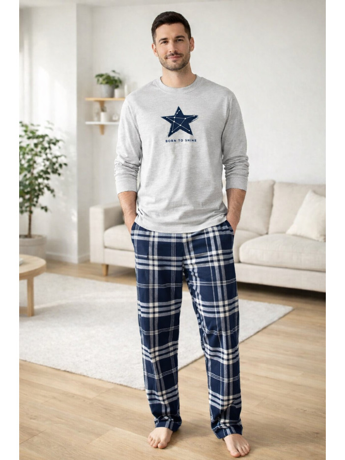 Мужская пижама со штанами Cosy 82728 от украинского бренда изготовленная их трикотажной ткани на основе хлопка. В комплект входит джемпер цвета меланж с длинными рукавами и округлой формой горловины. По центру джемпера изображена звезда с надписью "Born to Shine". Брюки прямого классического кроя на резинке в синюю клетку, по бокам штанов расположены карманы. Пижама выглядит очень презентабельно, ткань приятная к телу и не вызывает раздражение. Отличный подарок родному вам человеку.