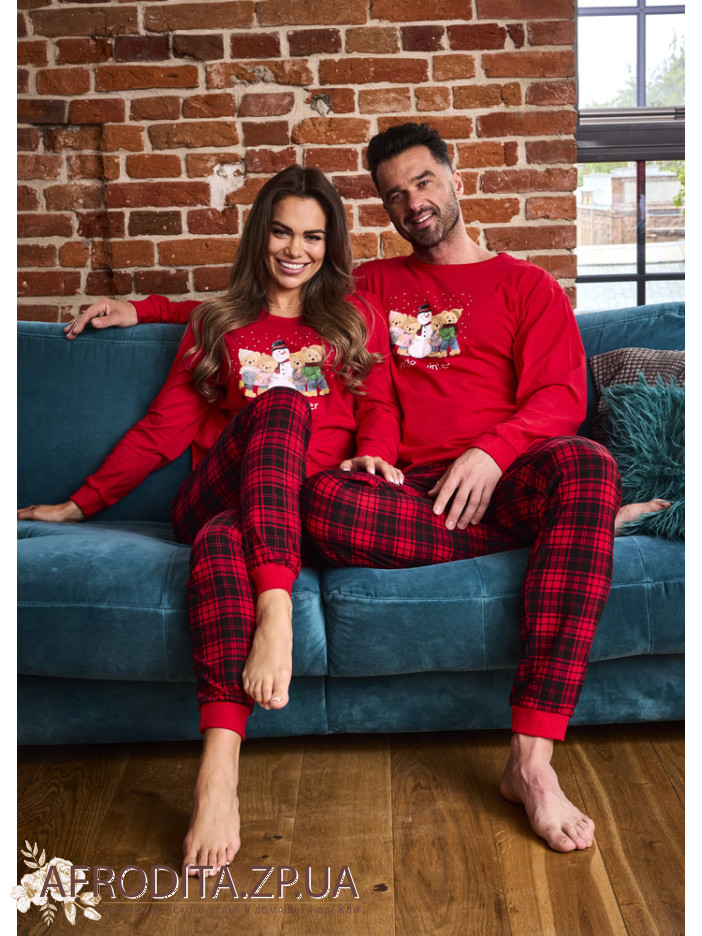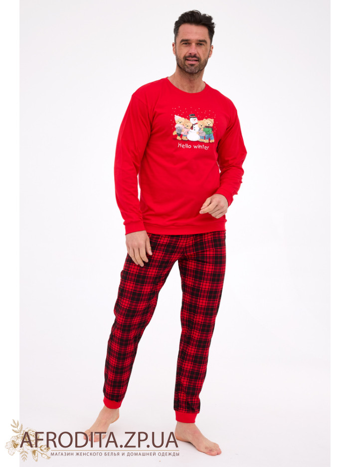 Мужской домашний комплект из хлопка Cornette 82635 производство Польша. Пижама состоит из однотонного красного джемпера с округлой горловиной, рукав длинный. по центру изображен снеговик с медведями. Брюки красного цвета в клетку прямого кроя, низ обработан красными манжетами. Отличный подарок близкому вам человеку.