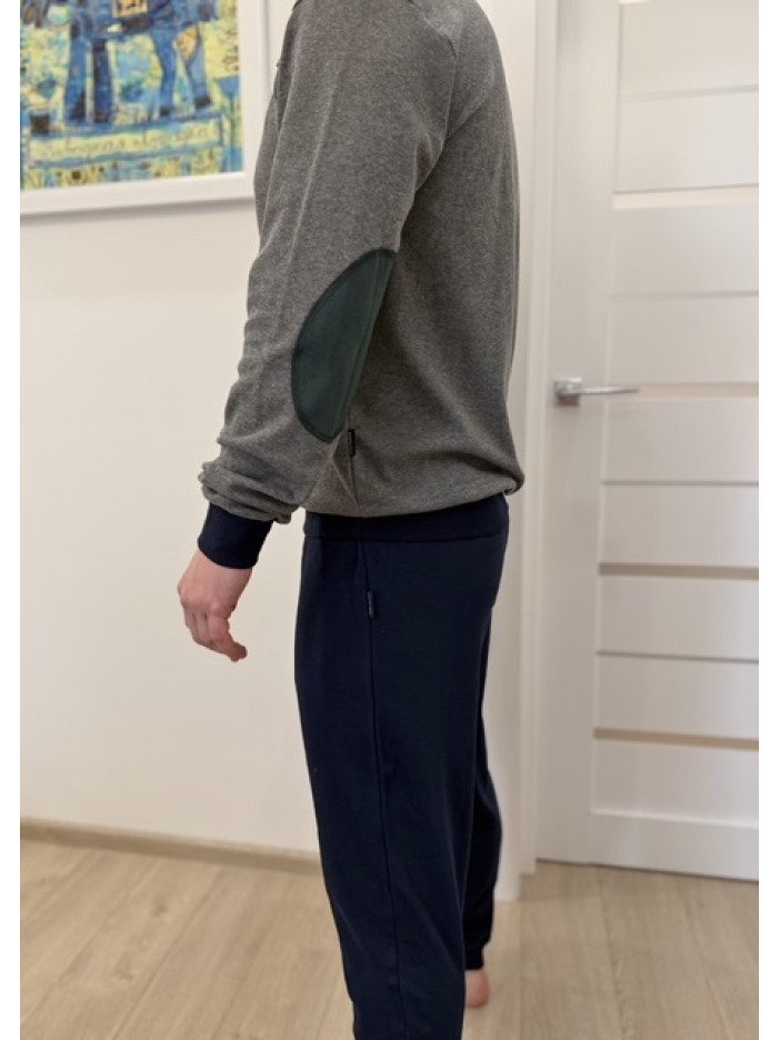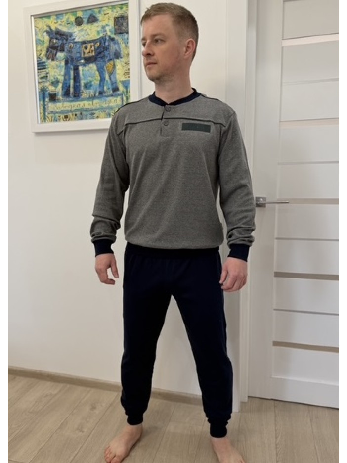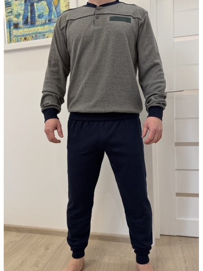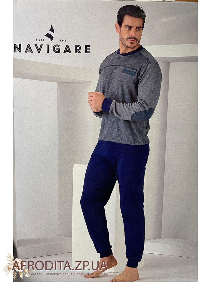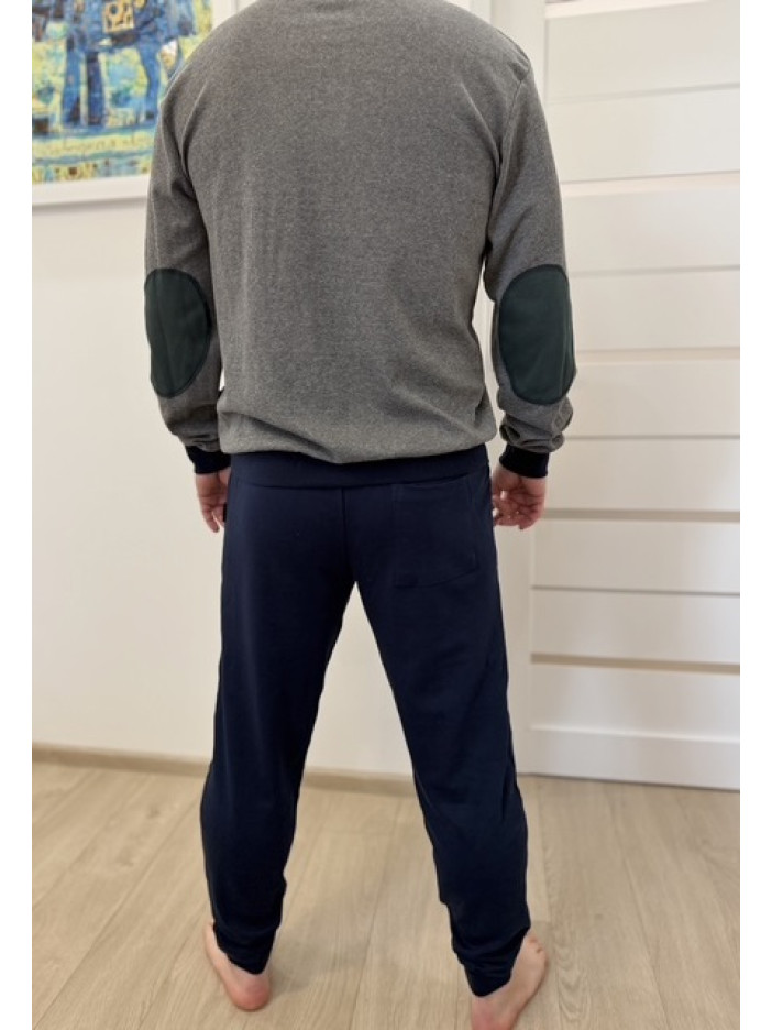 Мужской домашний комплект Navigare 141905-1 производство Италия изготовленный из хлопка. Пижама состоит из джемпера серого цвета с длинными рукавами, манжеты синего цвета, горловина округлой формы также декорирована синим кантом. Брюки однотонные тамно-синего цвета на резинке, по бокам расположены карманы. Модель очень практичная и комфортная. Отличная идея для подарка близкому вам человеку.