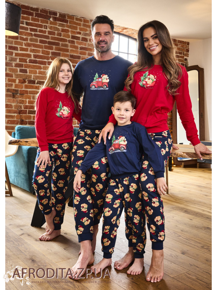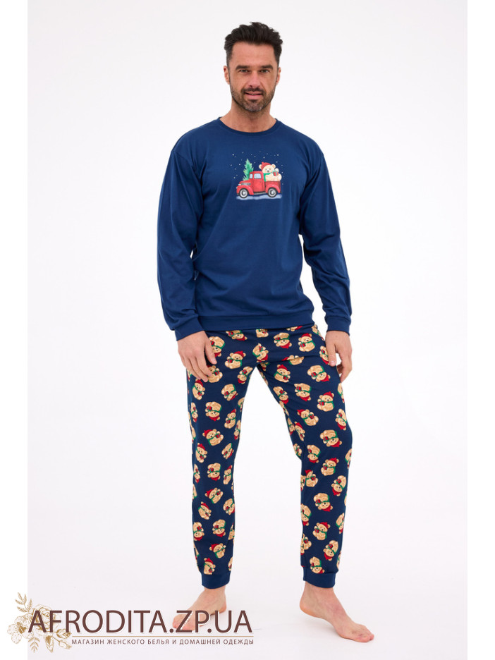 Мужской домашний комплект из хлопка Cornette 82634 производство Польша. Пижама состоит из кофты синего цвета с новогодним принтом по центру, рукав длинный, горловина имеет округлую форму. Брюки свободного кроя темно-синего цвета с принтом в виде медведей, на поясе мягкая резинка. Низ штанов обработаны манжетами.