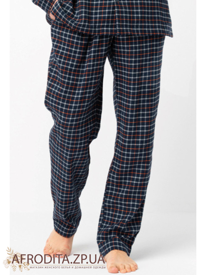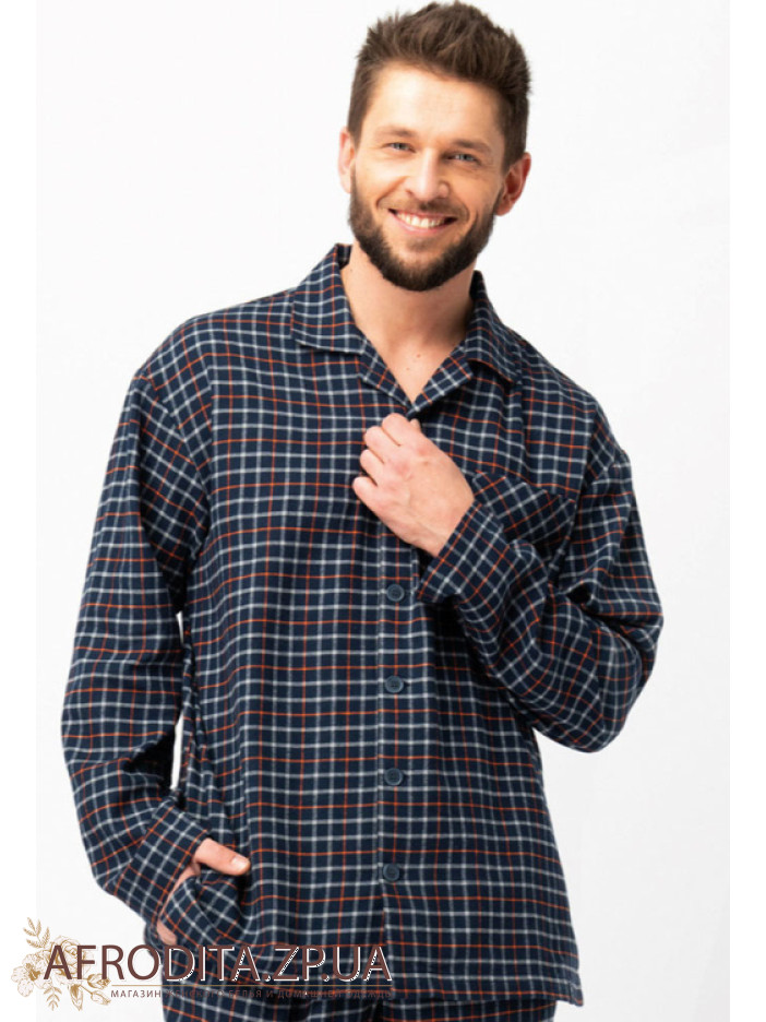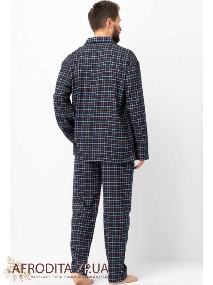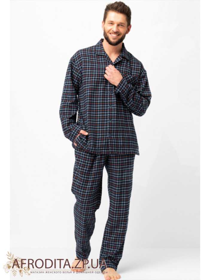 Мужской домашний комплект Key 82631 темно-синего цвета в клетку производство Польша. Пижама изготовлена из мягкой фланели на основе хлопка. Рубашка классического кроя с длинными рукавами, на груди расположен накладной карман. Модель застегивается на пуговицы, по бокам снизу есть небольшие разрезы. Штаны прямого кроя на резинке с боковыми карманами.