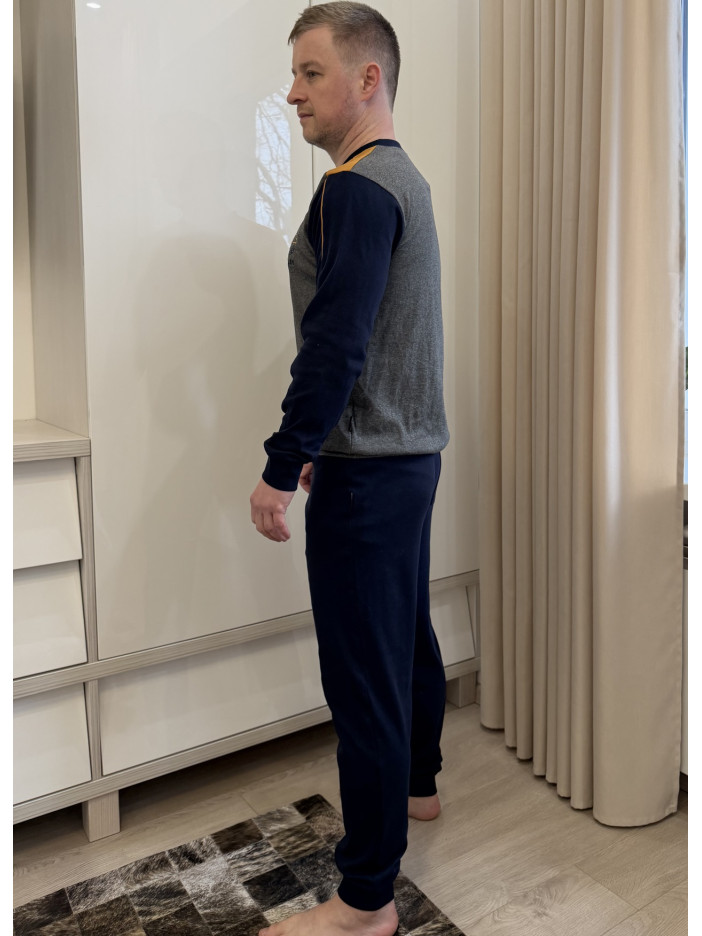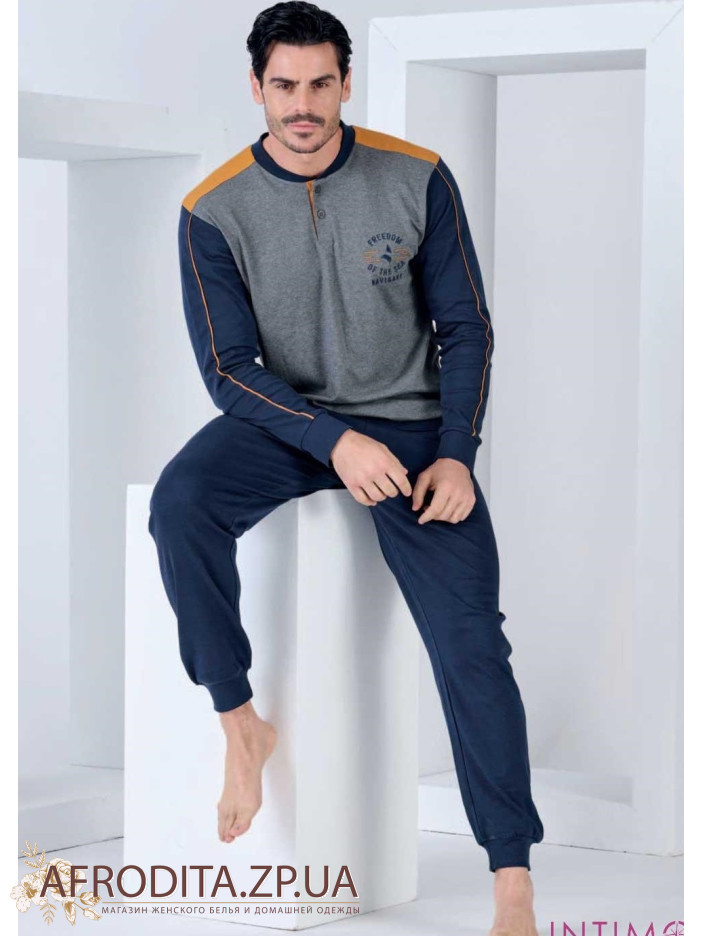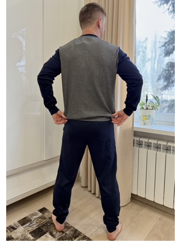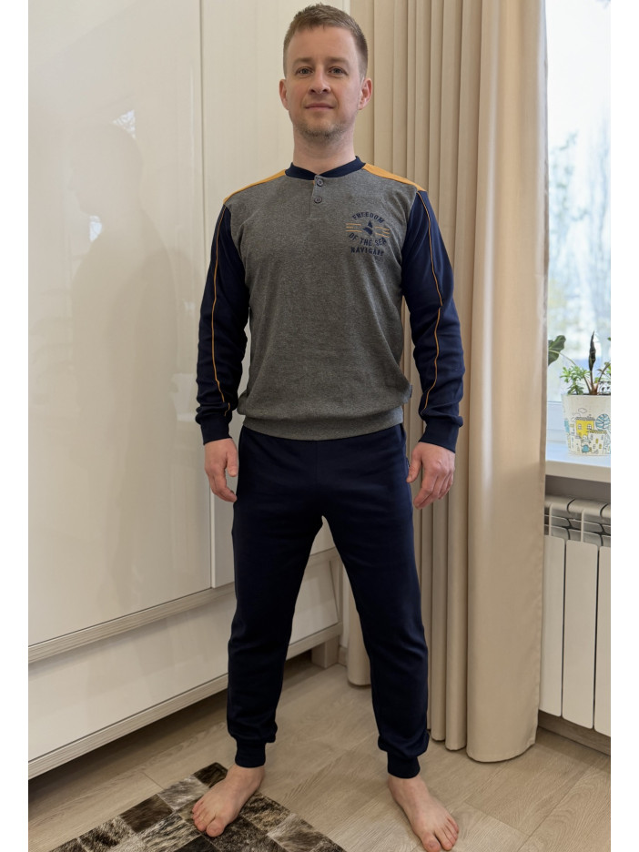 Мужской домашний костюм 141900-1 от итальянской торговой марки Navigare из трикотажной ткани на основе хлопка. Модель состоит из джемпера серого цвета с длинными рукавами синего цвета, на плечах в качестве декора расположены вставки оранжевого цвета. Рукав также декорирован контрастным кантом оранжевого цвета. Горловина округлой формы на пуговице и украшена синим кантом. Брюки однотонные синего цвета прямого кроя на резинке. Модель выглядит очень стильно и презинтабельно. Хороший подарок дорогому вам человеку.