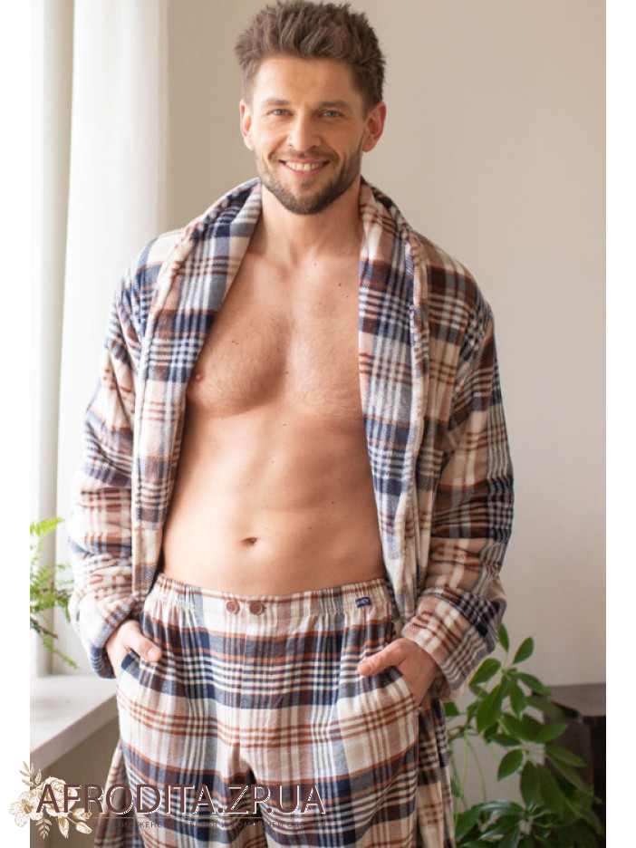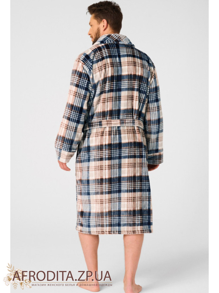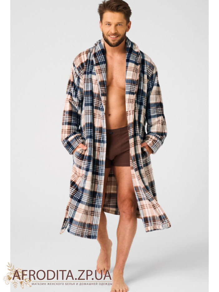Мужской теплый халат из флиса Key 82628 производство Польша. Модели бежевого цвета в клетку длинной ниже колен, Халат завязывается на запах, с помощью пояса можно регулировать линию талии. По бокам расположены карманы. Халат мягкий и приятный к телу и может послужить хорошей идеей для подарка.