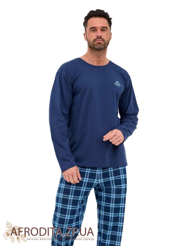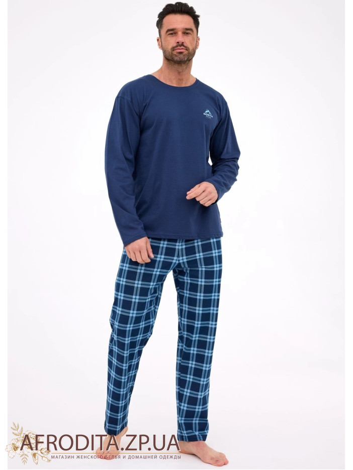 Пижама мужская из хлопка со штанами Cornette 82637 производство Польша. Комплект состоит из однотонного джемпера синего цвета с длинными рукавами. Брюки в темно-синюю клетку прямого классического кроя, на поясе мягкая резинка. Модель выглядит очень презентабельно и отлично подойдет в качестве подарка близкому вам человеку.
