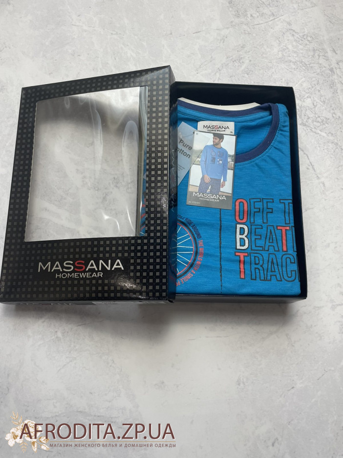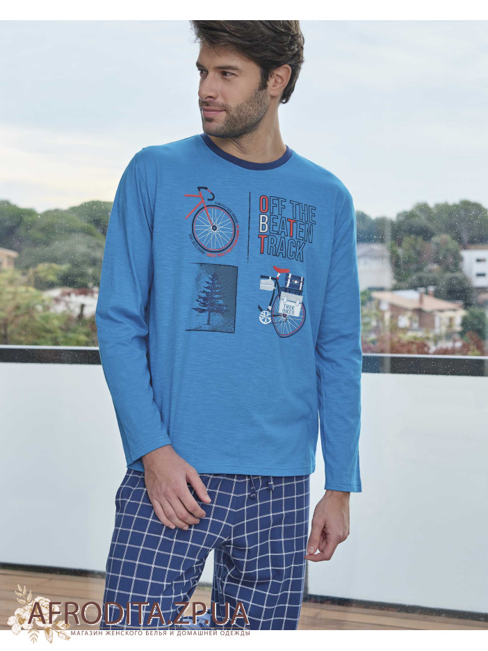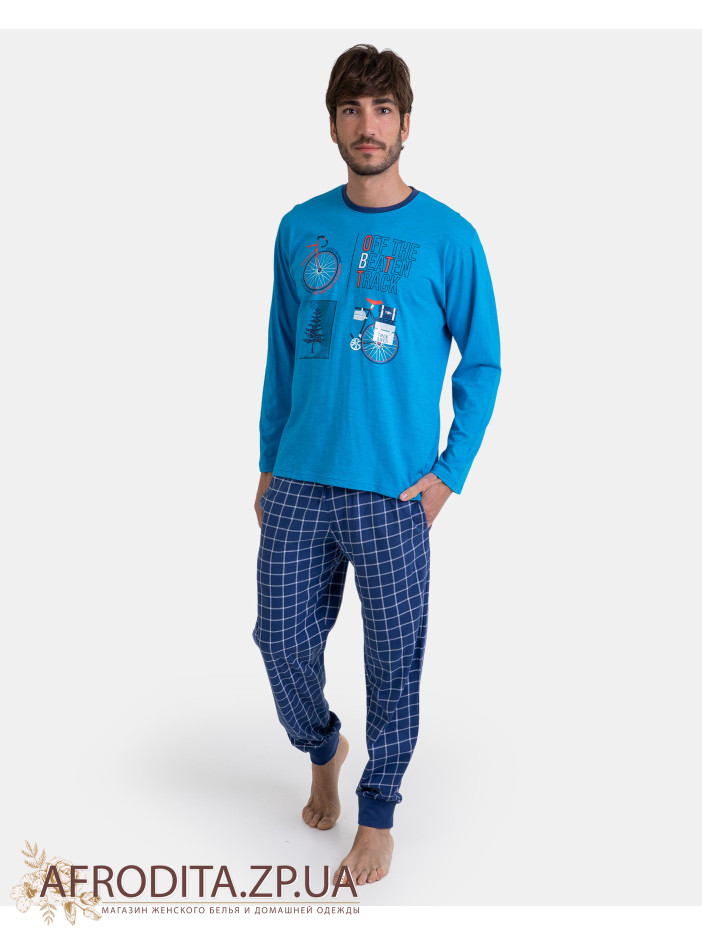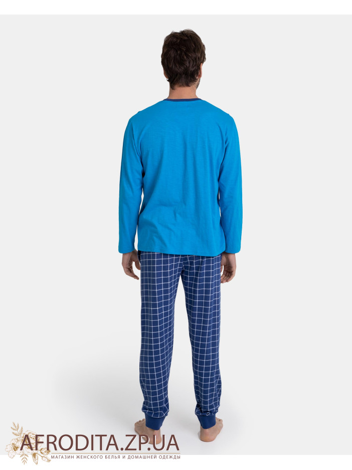 Пижама мужская с брюками Massana P731311 из натурального хлопка. Комплект состоит из кофты голубого цвета с длинным рукавом и штанов в клетку с боковыми карманами.