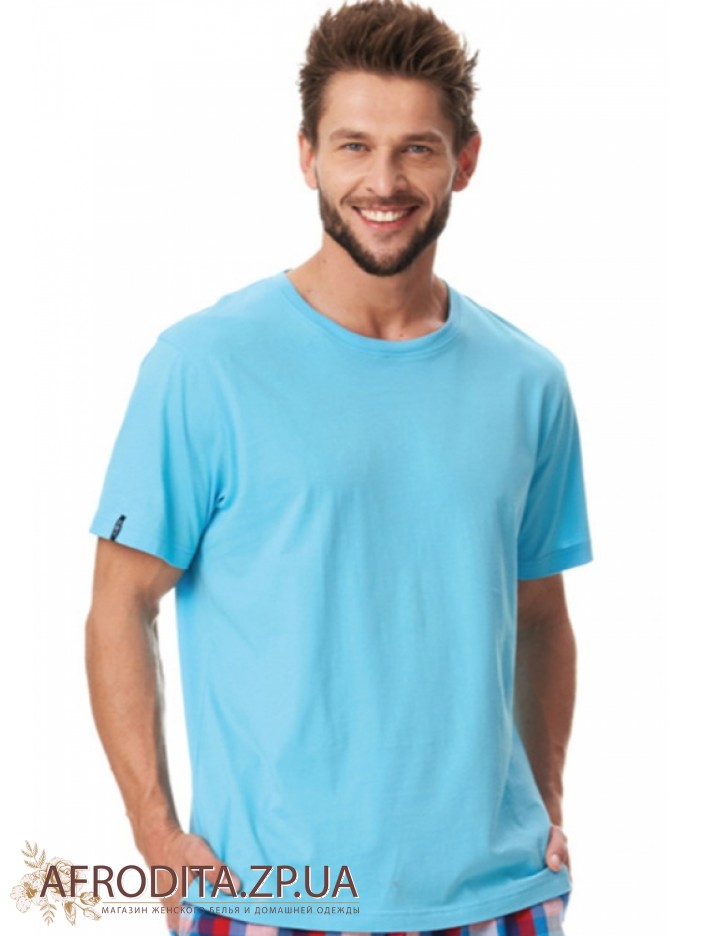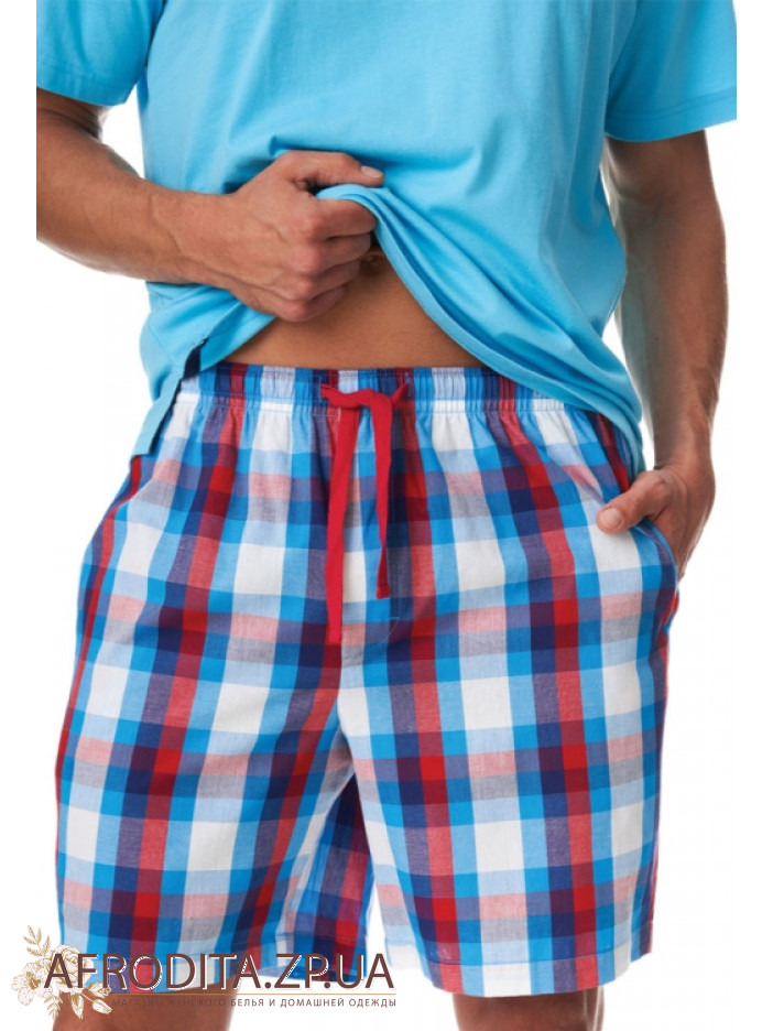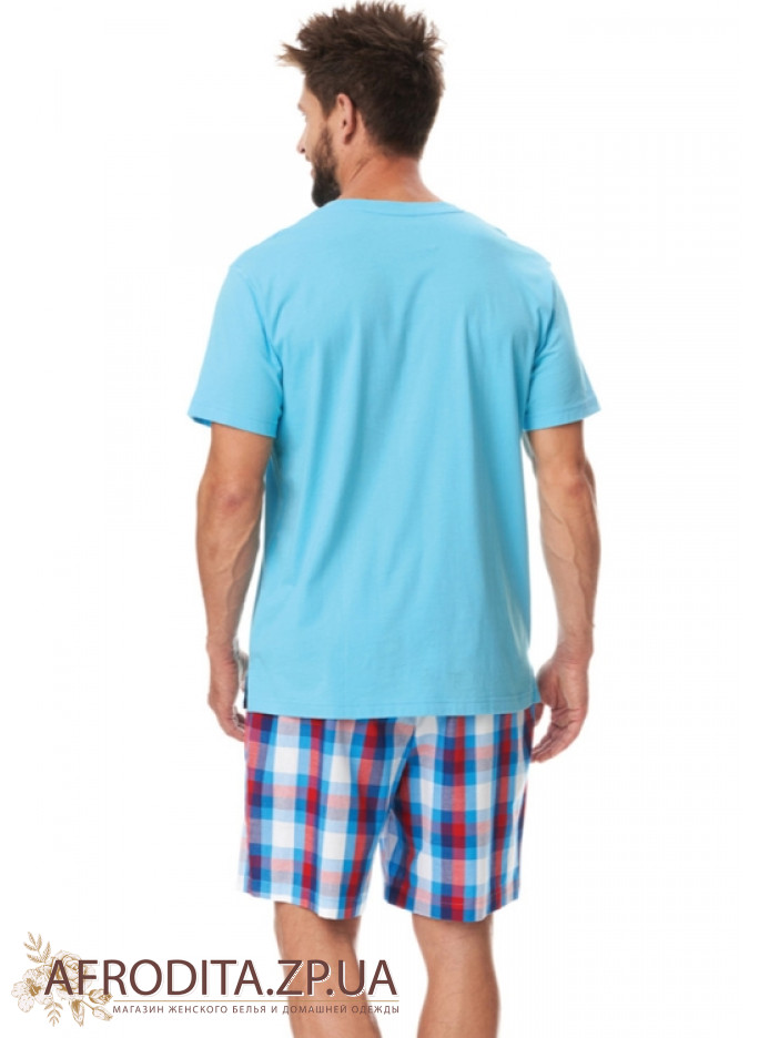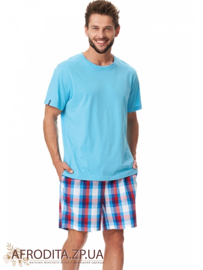 Пижама мужская с шортами Key MNS 454 A23 изготовленная из высококачественного трикотажного полотна. Комплект состоит из однотонной футболки голубого цвета, горловина имеет округлую форму, шорты в клетку прямого кроя, по бокам расположены карманы. Линию талии можно регулировать шнуровкой.