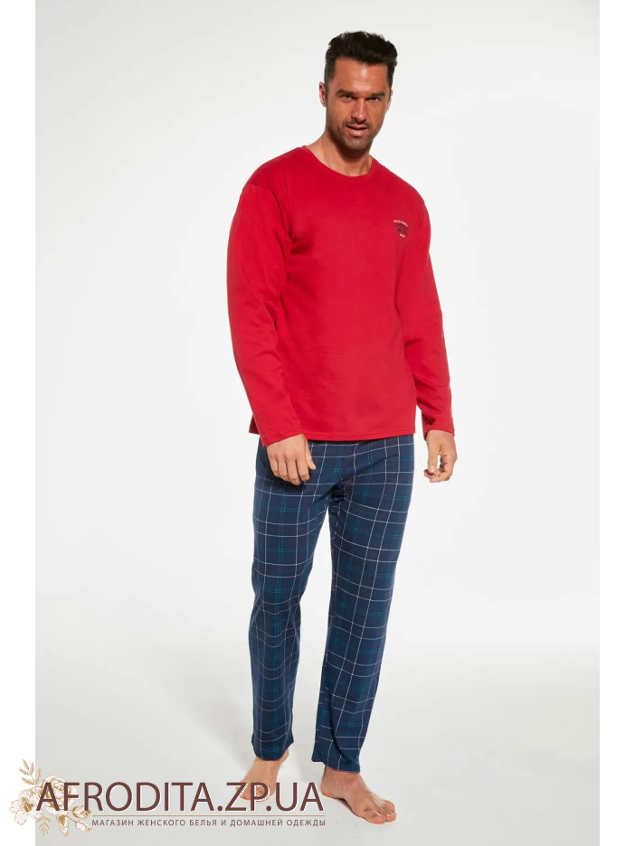Пижама мужская со штанами 244 Redwood изговнённая из трикотажной ткани. Комплект состоит из однотонного джемпера бежевого цвета с длинными рукавами и штанов в клетку.