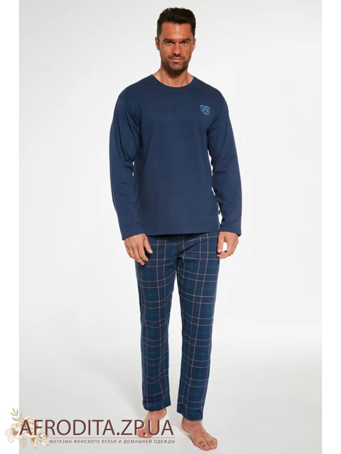 Пижама мужская со штанами 245 Redwood изговнённая из трикотажной ткани. Комплект состоит из однотонного джемпера бежевого цвета с длинными рукавами и штанов в клетку.