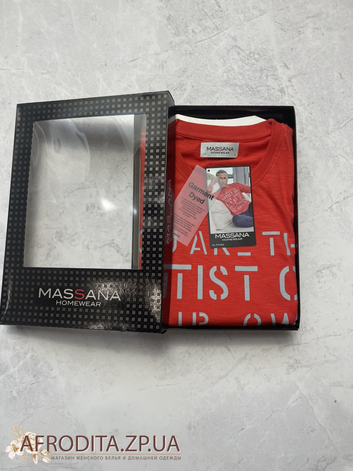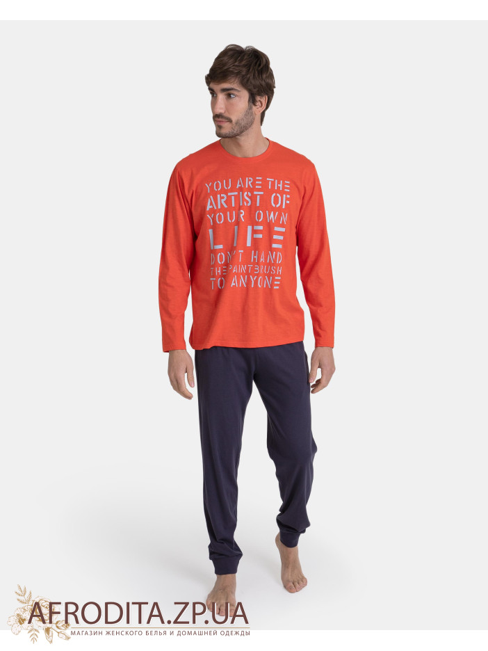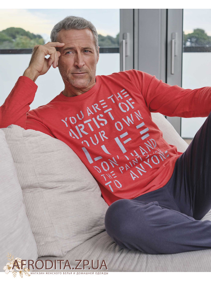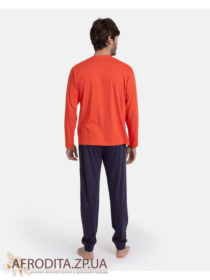 Пижама мужская со штанами Massana P731303 изготовленный из высококачественного хлопка. Комплект состоит из джемпера с длинными рукавами красного цвета и однотонных штанов прямого кроя.
