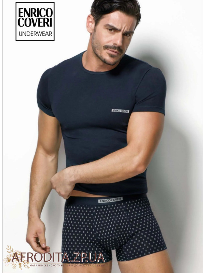 Комплект мужского белья EnricoCoveri EC1254. Комплект состоит из футболки и трусов боксеров, выполнен из высококачественной хлопковой ткани с добавлением эластана, за счет этого изделия не растягиваются и не меняют форму после стирки. На футболке изображен фирменный логотип. Кролики с удобной посадкой. Ткань с мелким абстрактным узором.
