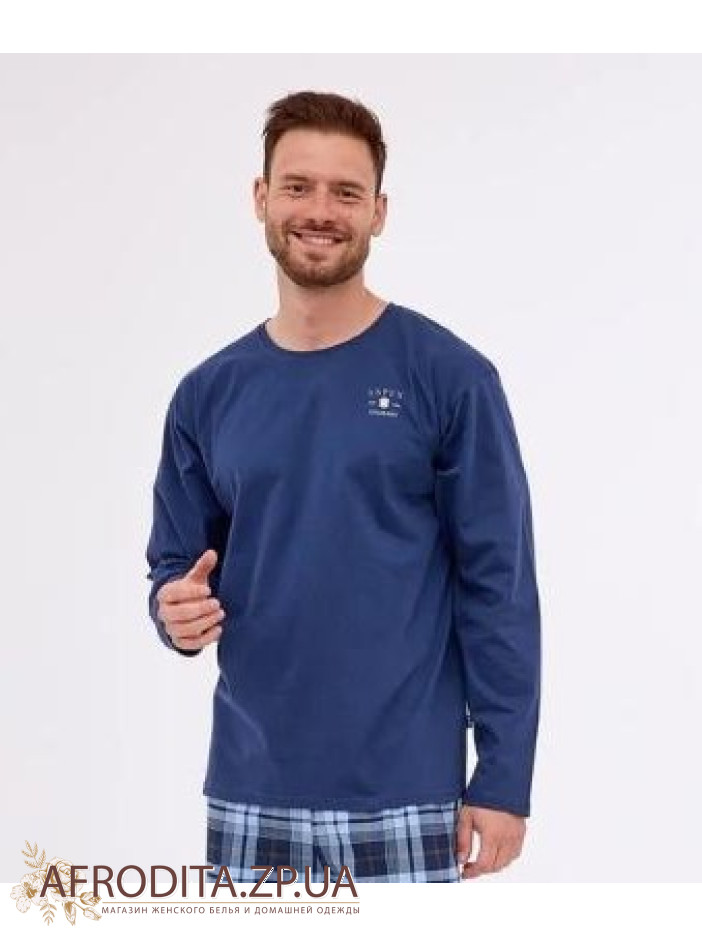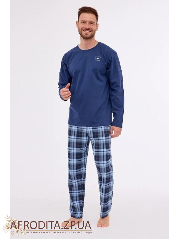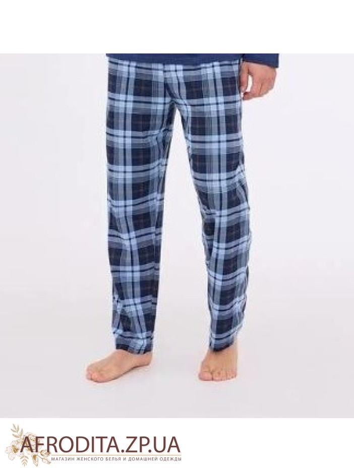 Мужская пижама с брюками 124-263 B24 из трикотажного полотна. Комплект состоит из однотонного джемпера синего цвета с длинным рукавом и штанов на резинке в шотландскую клетку.