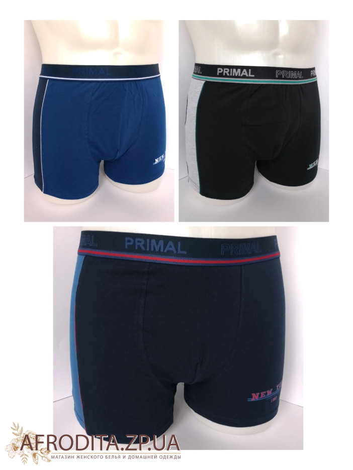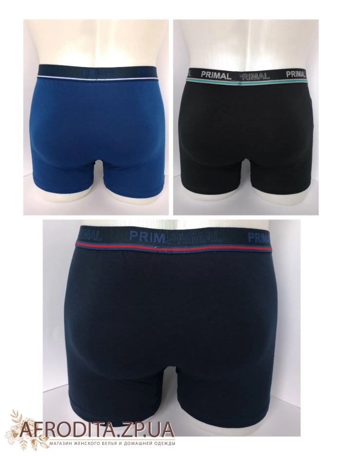 Мужские хлопковые трусы боксеры Primal B351. Набор из 3-х штук в одной упаковке. Цена указана за 1 ед. Пояс на широкой эластичной резинке c надписью "PRIMAL". Задняя деталь изделия беcшовная. Котоновые трусы с добавлением эластана. В упаковке три расцветки - синий, тёмно синий, черный.